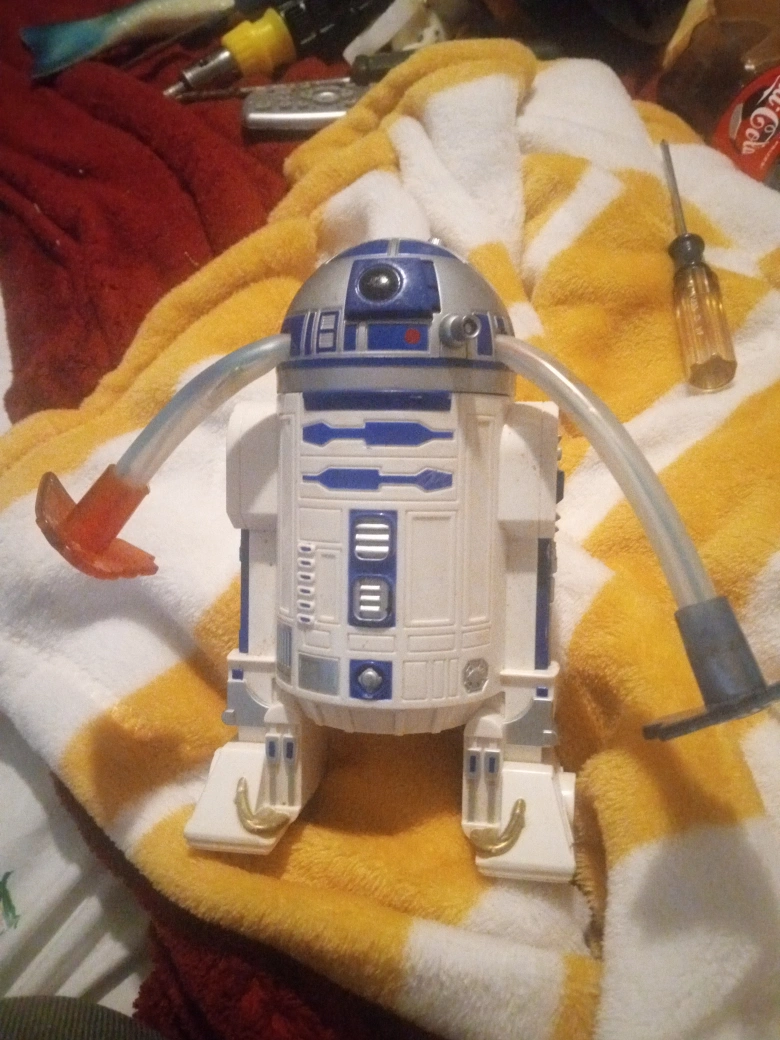 sorry I do not know the year but this is a light up talking R2D2 that spins his head and lights up on all sides the plastic is a little shipped here and there on the light piece but it's still good and good shape if you are R2-D2 lover the side button on both sides aren't a good shape the only one that works for the button that is an operates the R2D2 unit is the one on the right side of our 2D2 I'm only asking 40