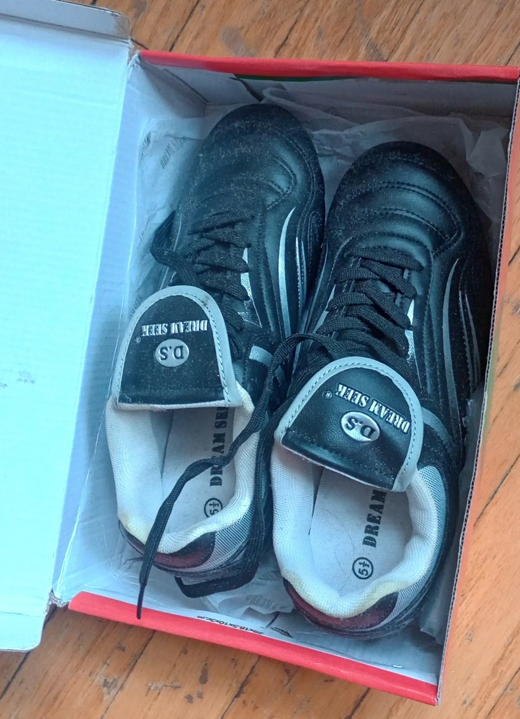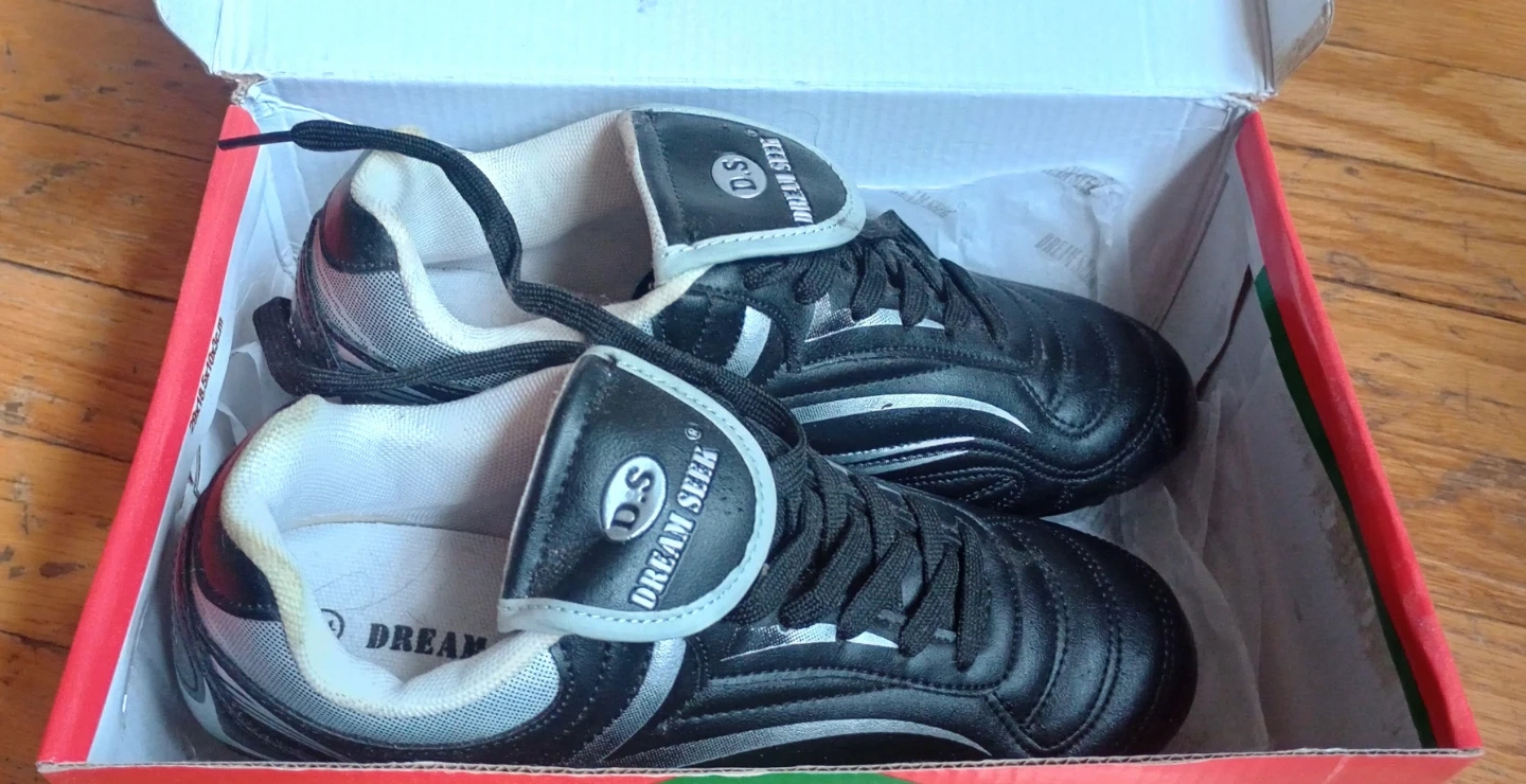 These black Dream Seek soccer cleats are size 5. They're designed for kids. The shoes come in their original box.