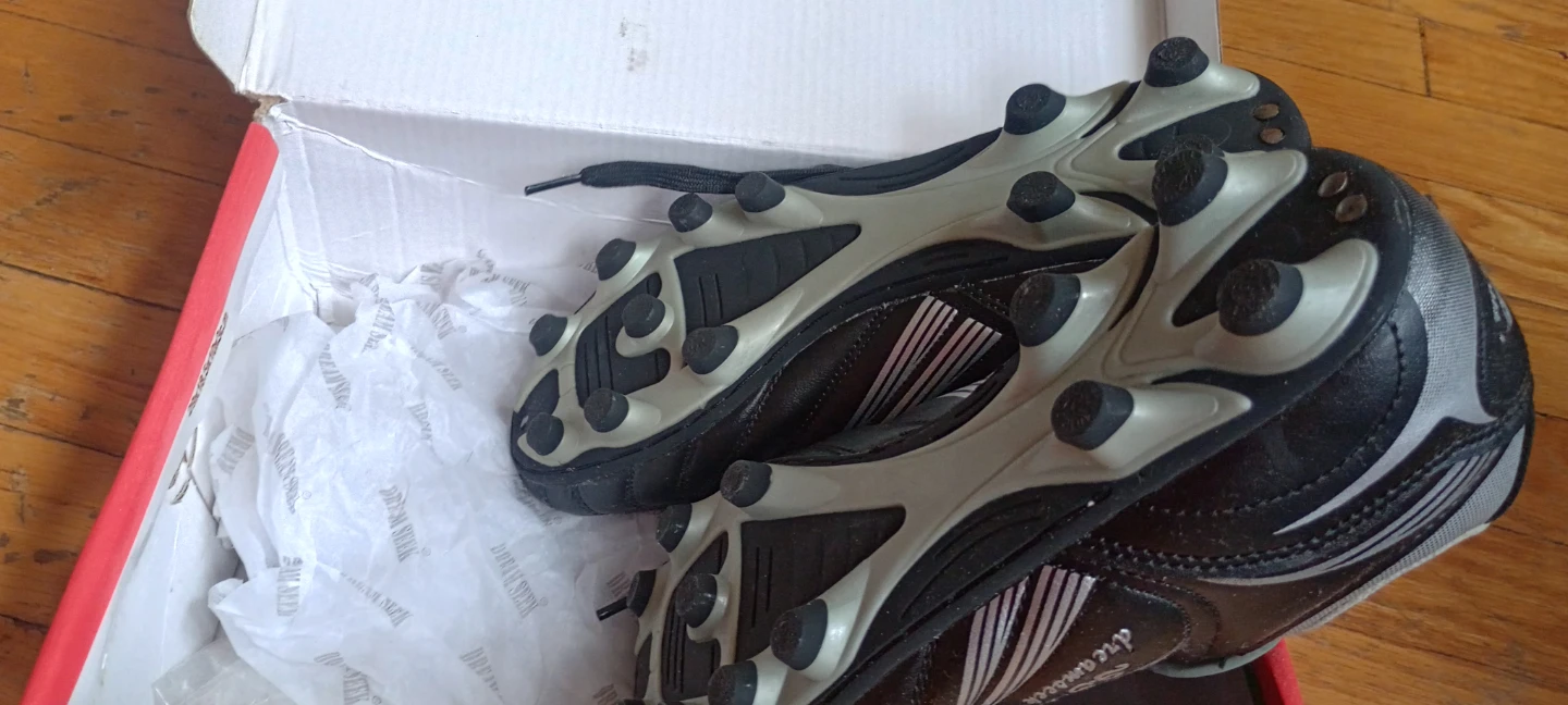 These black Dream Seek soccer cleats are size 5. They're designed for kids. The shoes come in their original box.