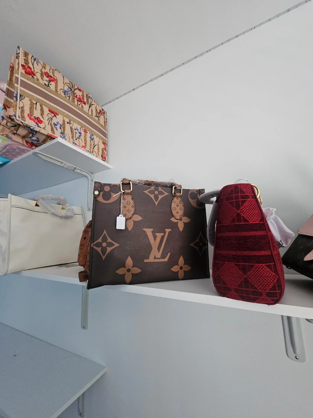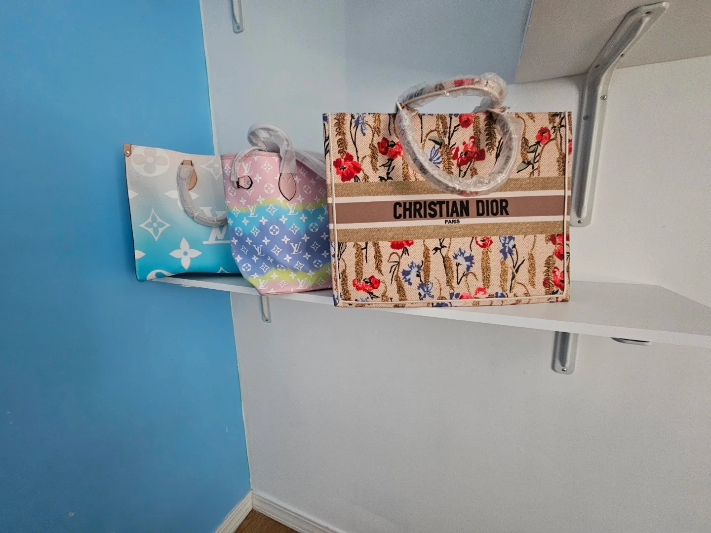 Christian Dior tote bag with a floral design. It has a beige background with colorful flowers and leaves. The bag features the brand name printed across the front.