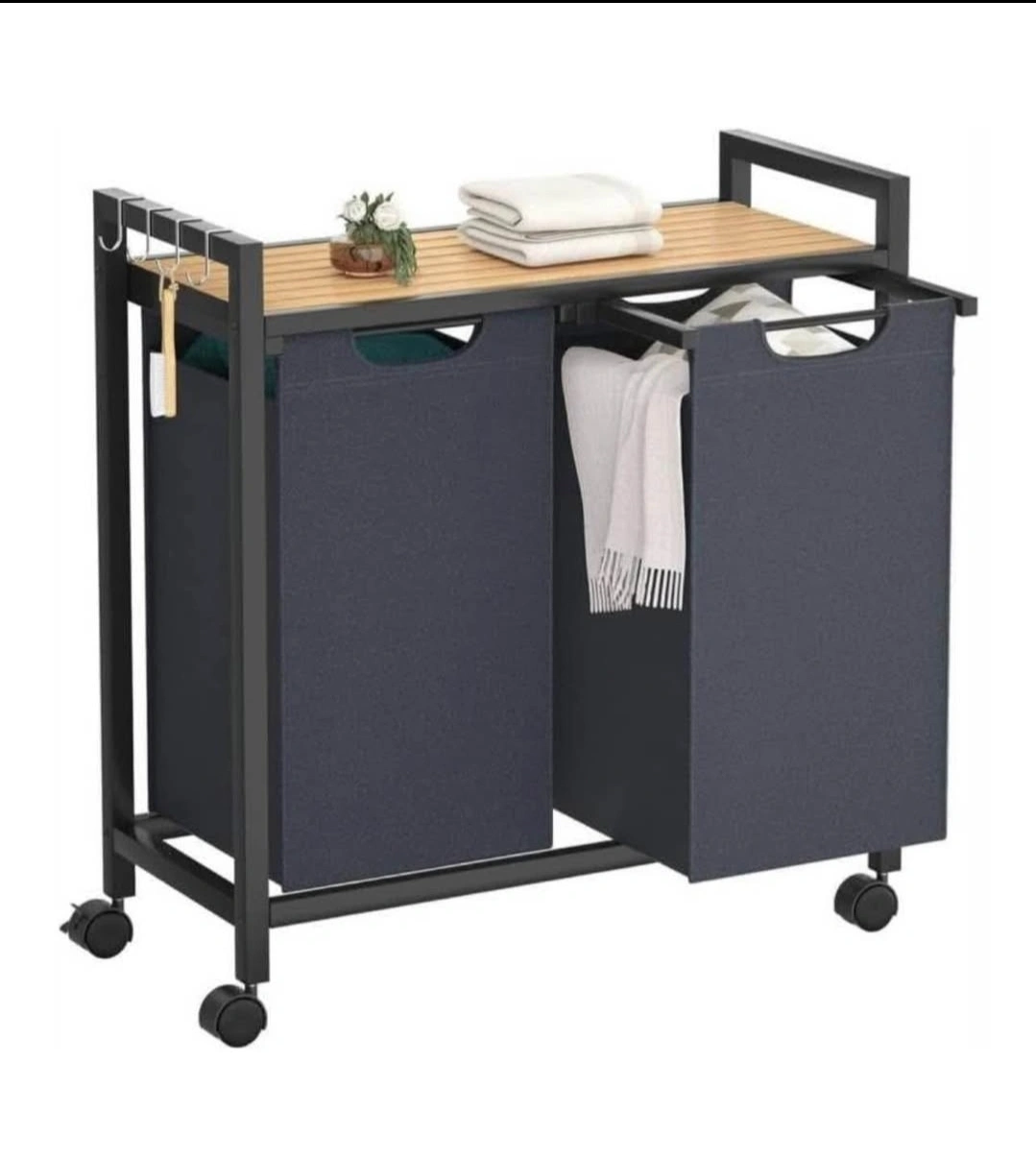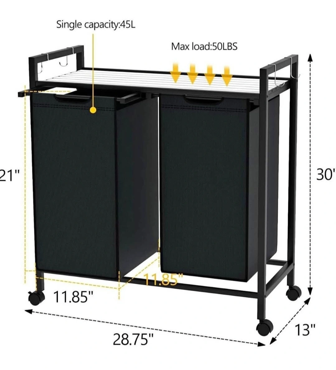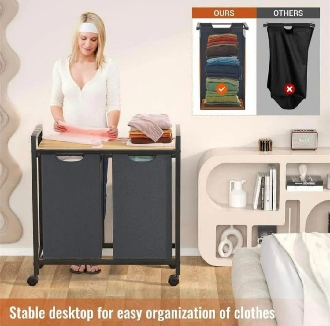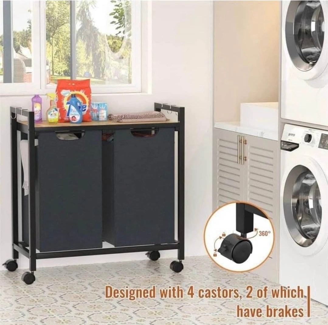 Two fabric hampers. Wooden top shelf. Metal frame. 4 casters, 2 with brakes. Holds 50 lbs. Great for laundry rooms, bedrooms, or bathrooms.