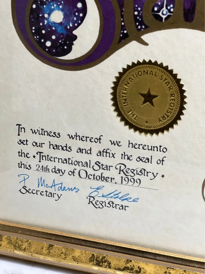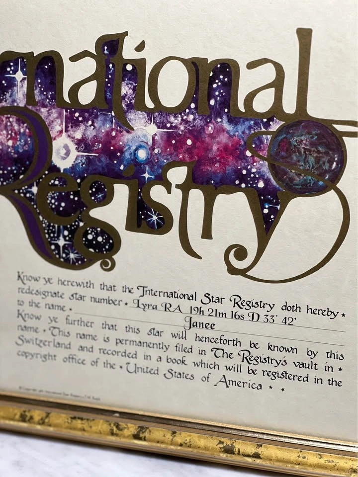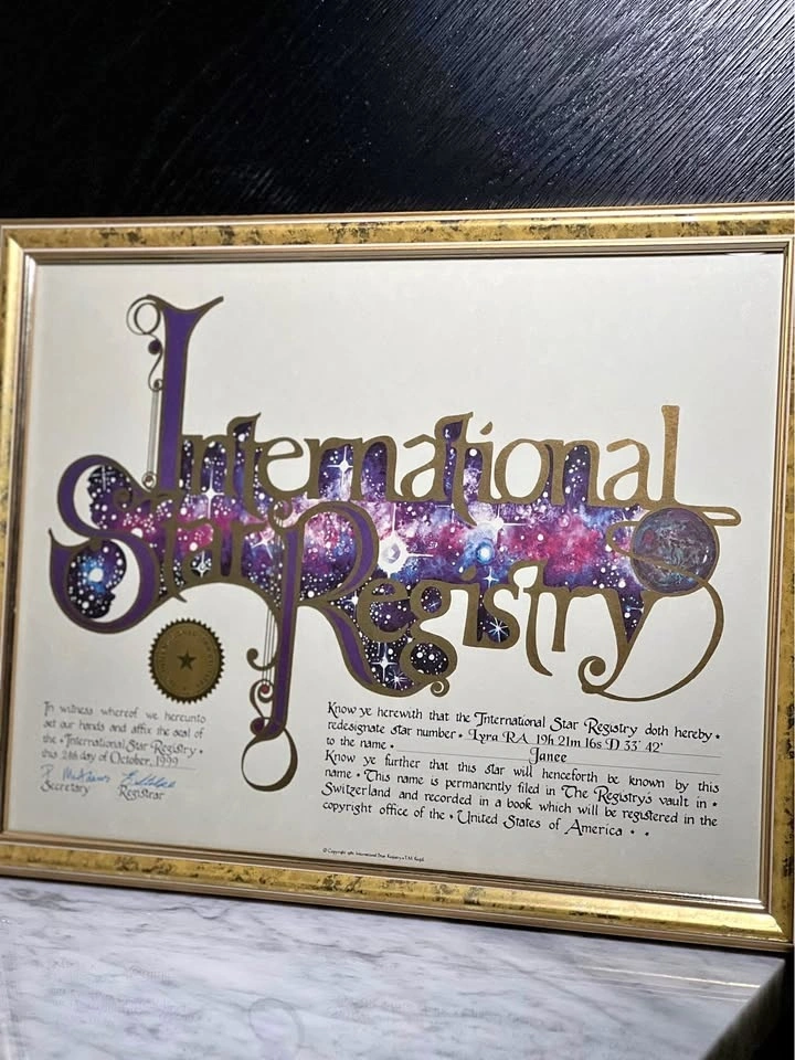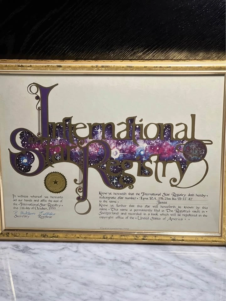 This is a framed International Star Registry certificate for a star named Janee. The certificate states the star's coordinates are Lyra RA 19h 21m 16s D 33° 42'. The name is permanently filed in a vault in Switzerland and recorded in a book copyrighted in the United States. The certificate was issued on October 2th, 1999.