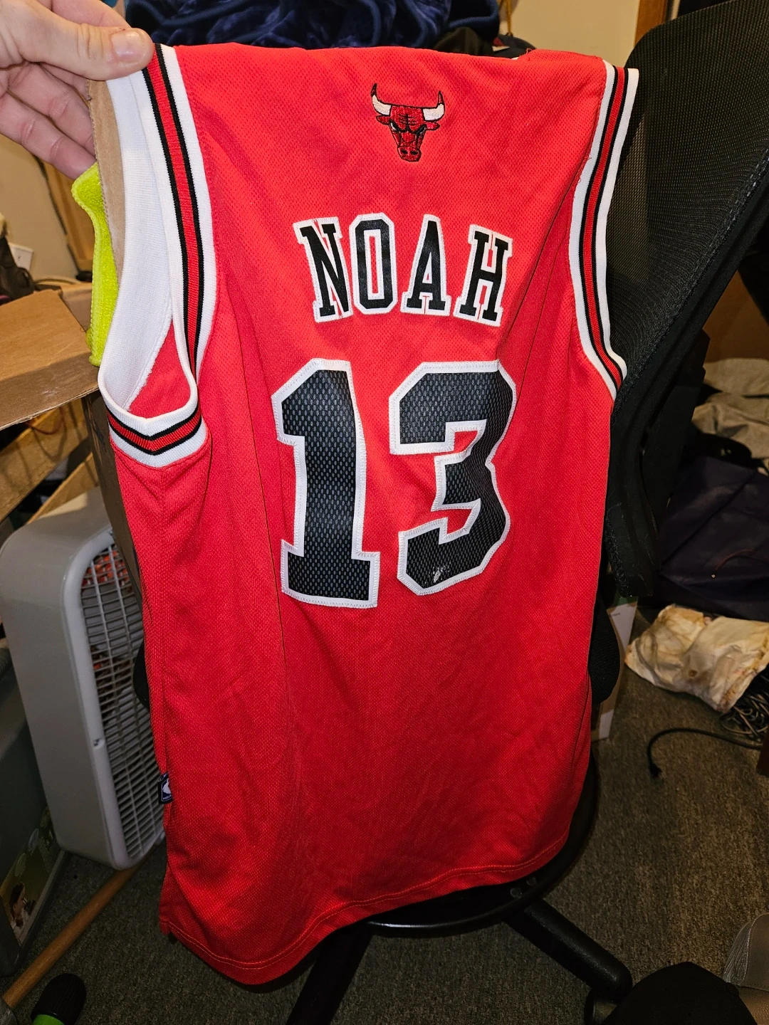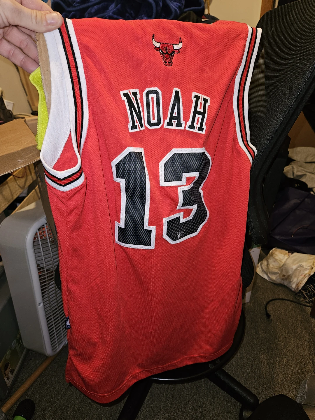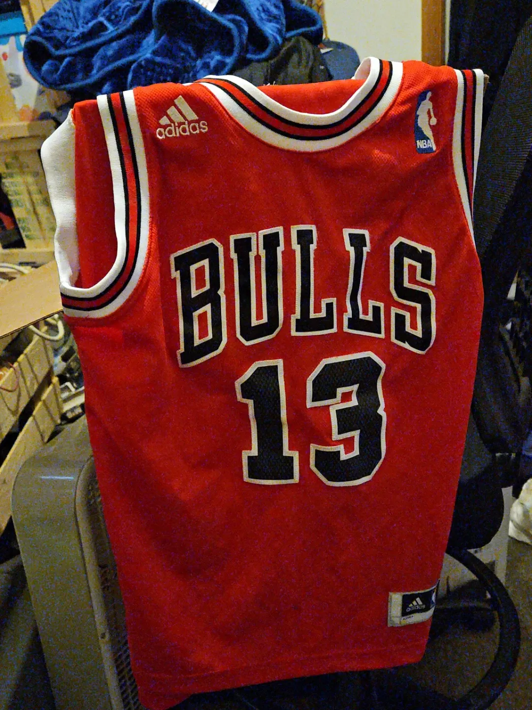 This is a Joakim Noah Chicago Bulls #13 jersey. It's made by Adidas and features the classic Bulls design. The jersey is red with white and black trim asking $20.00 cash and pick up only