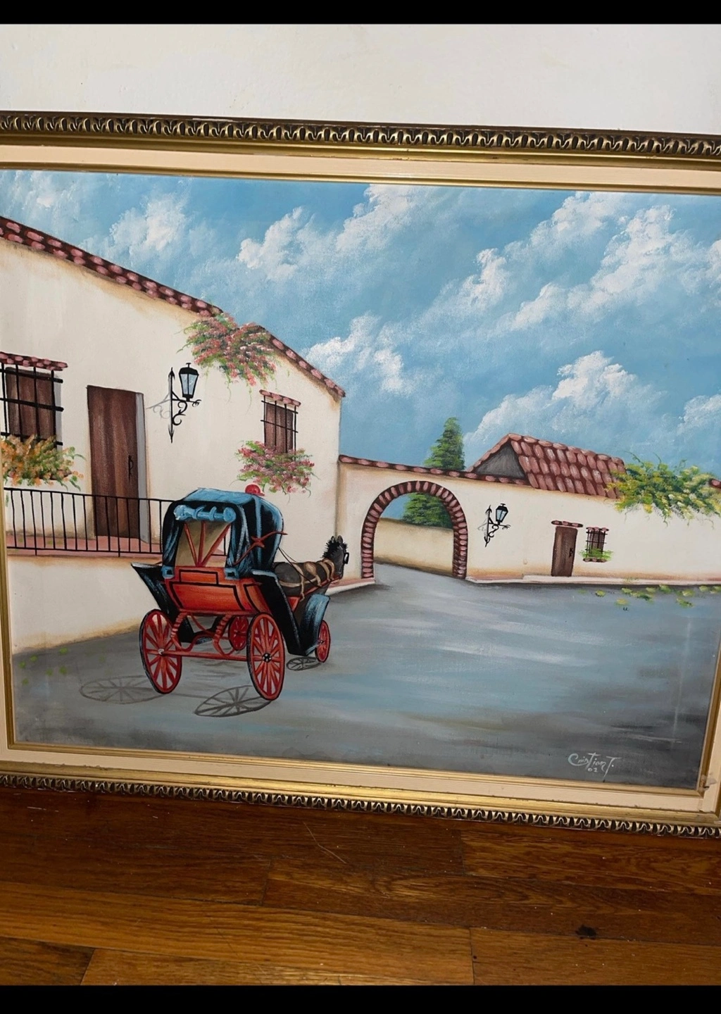 Beautiful oil painting. Depicts a horse-drawn carriage in a quaint town setting. Large size, wooden frame. Created in 2002.