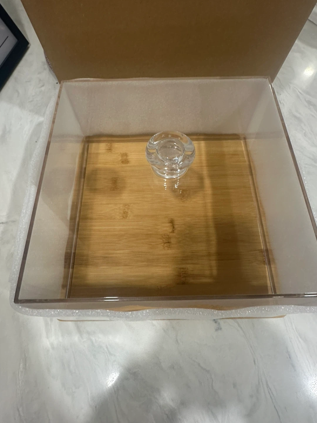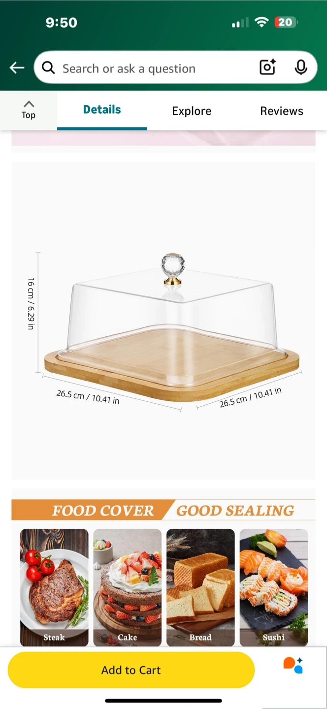Selling a brand new Cabillock Square Cake Stand with Lid. It's perfect for displaying cakes, desserts, or other treats. The stand is made of wood and has a clear lid to keep your food fresh. It measures 26.5 cm / 10.41 in. in length and width, and 16 cm / 6.29 in. in height. This is a great way to elevate your presentation
