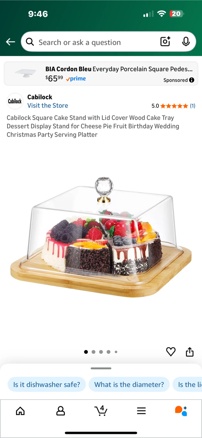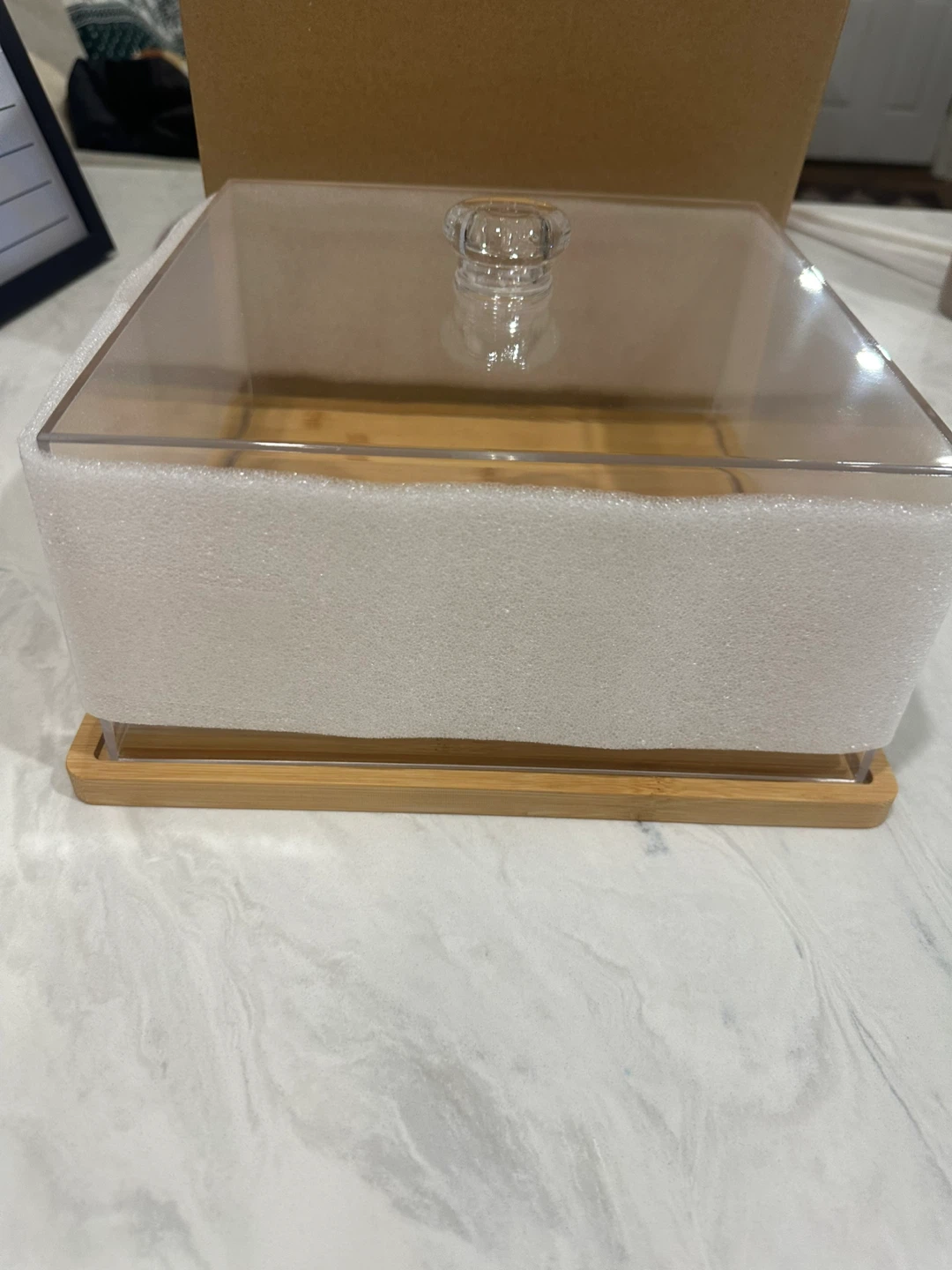 Selling a brand new Cabillock Square Cake Stand with Lid. It's perfect for displaying cakes, desserts, or other treats. The stand is made of wood and has a clear lid to keep your food fresh. It measures 26.5 cm / 10.41 in. in length and width, and 16 cm / 6.29 in. in height. This is a great way to elevate your presentation
