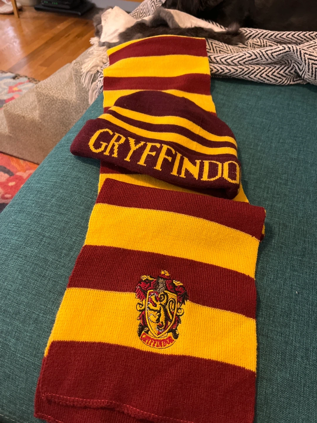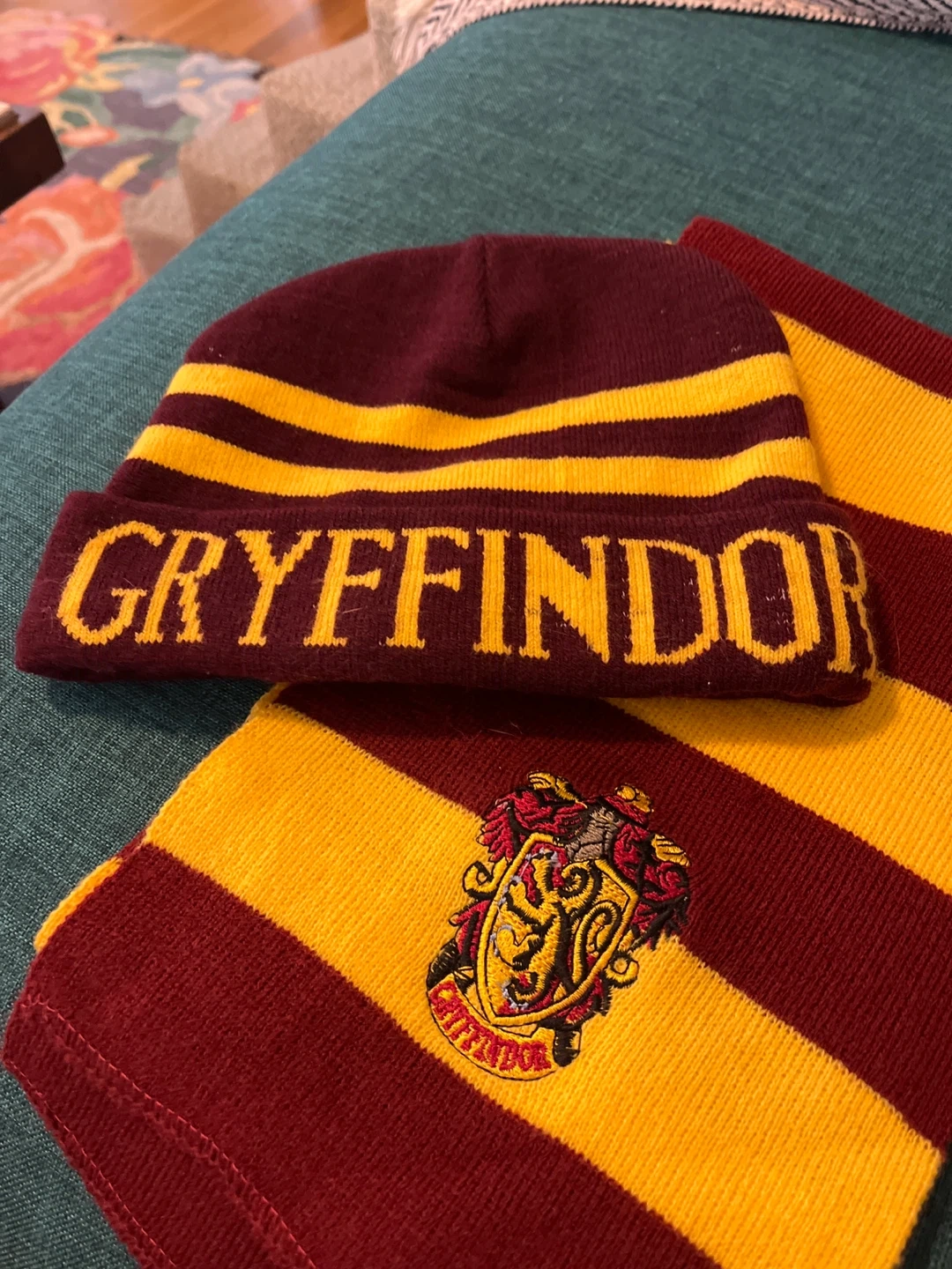 Gryffindor beanie and scarf set from the Harry Potter series. The beanie has the word "Gryffindor" knit into it and the scarf has the Gryffindor crest. Great for any Harry Potter fan!