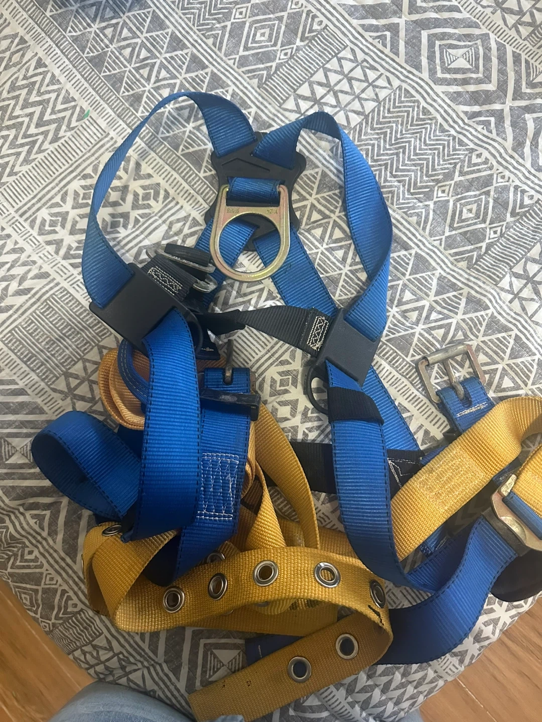This is a blue and yellow safety harness. It has multiple adjustable straps and D-ring attachment points for secure fall protection. Made from durable nylon webbing.