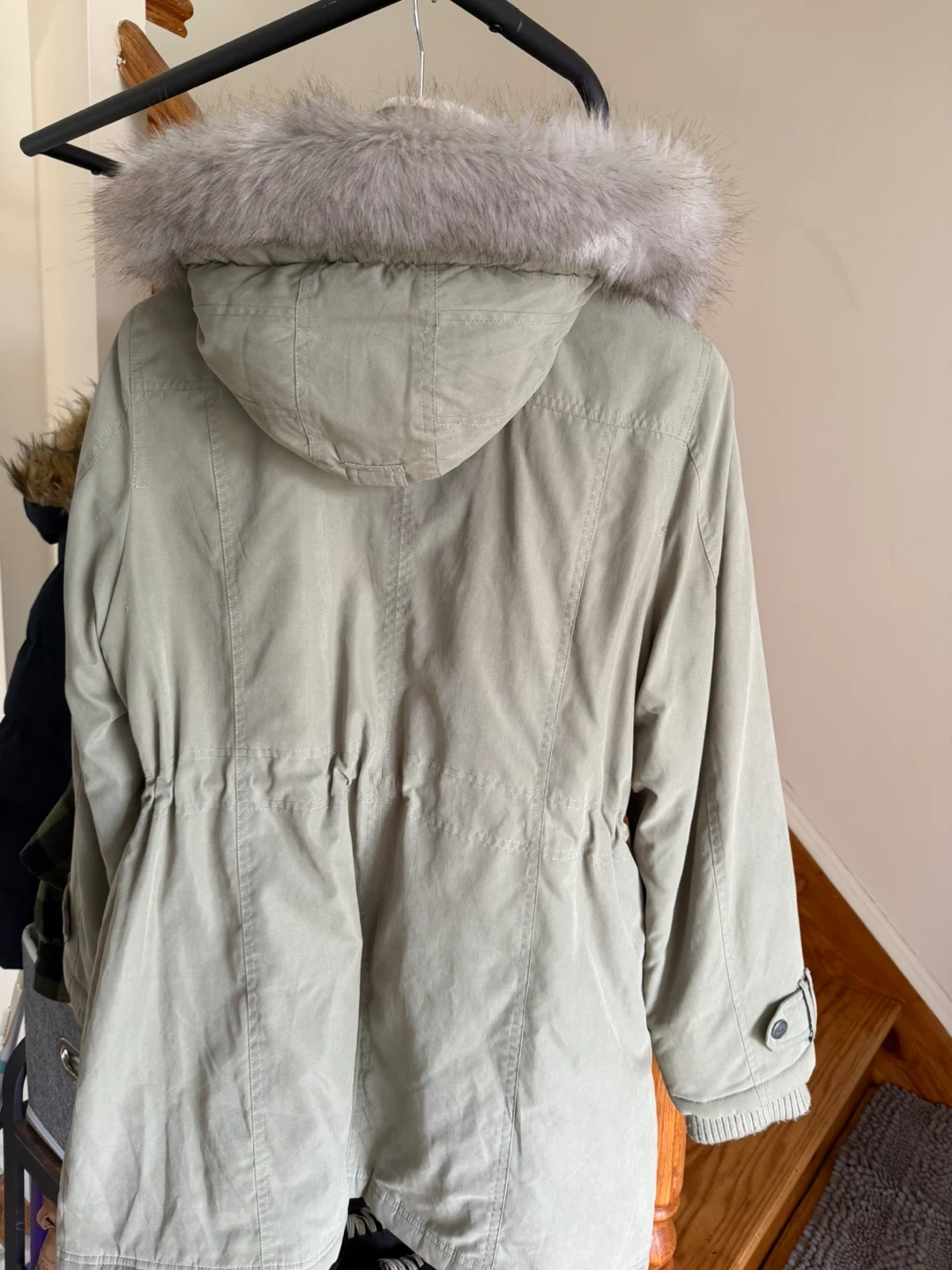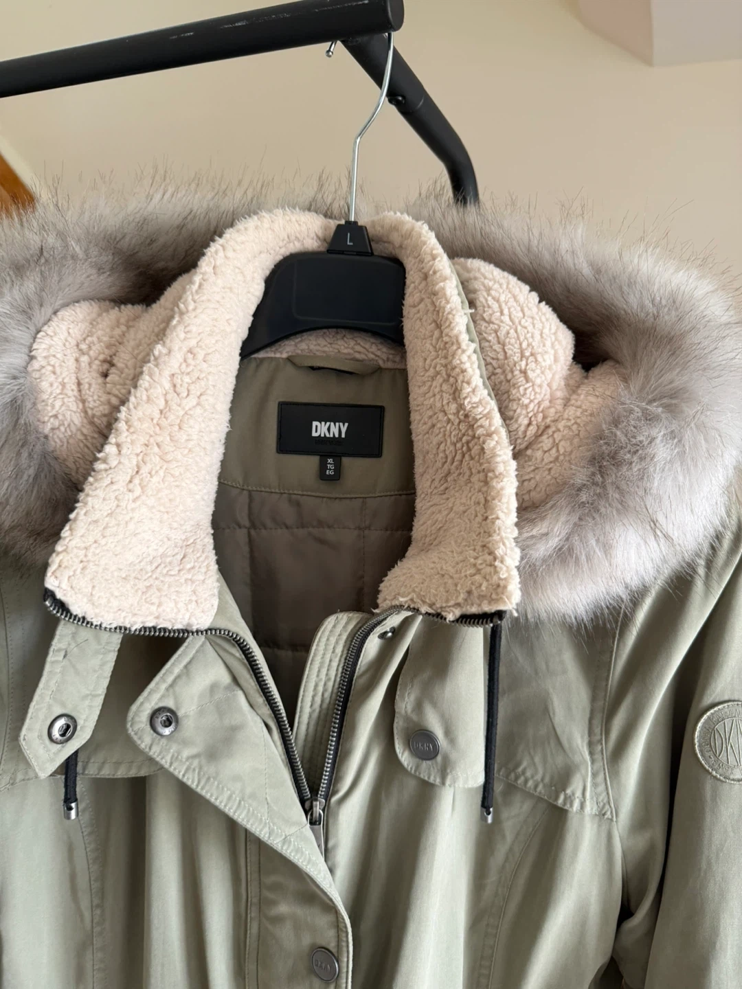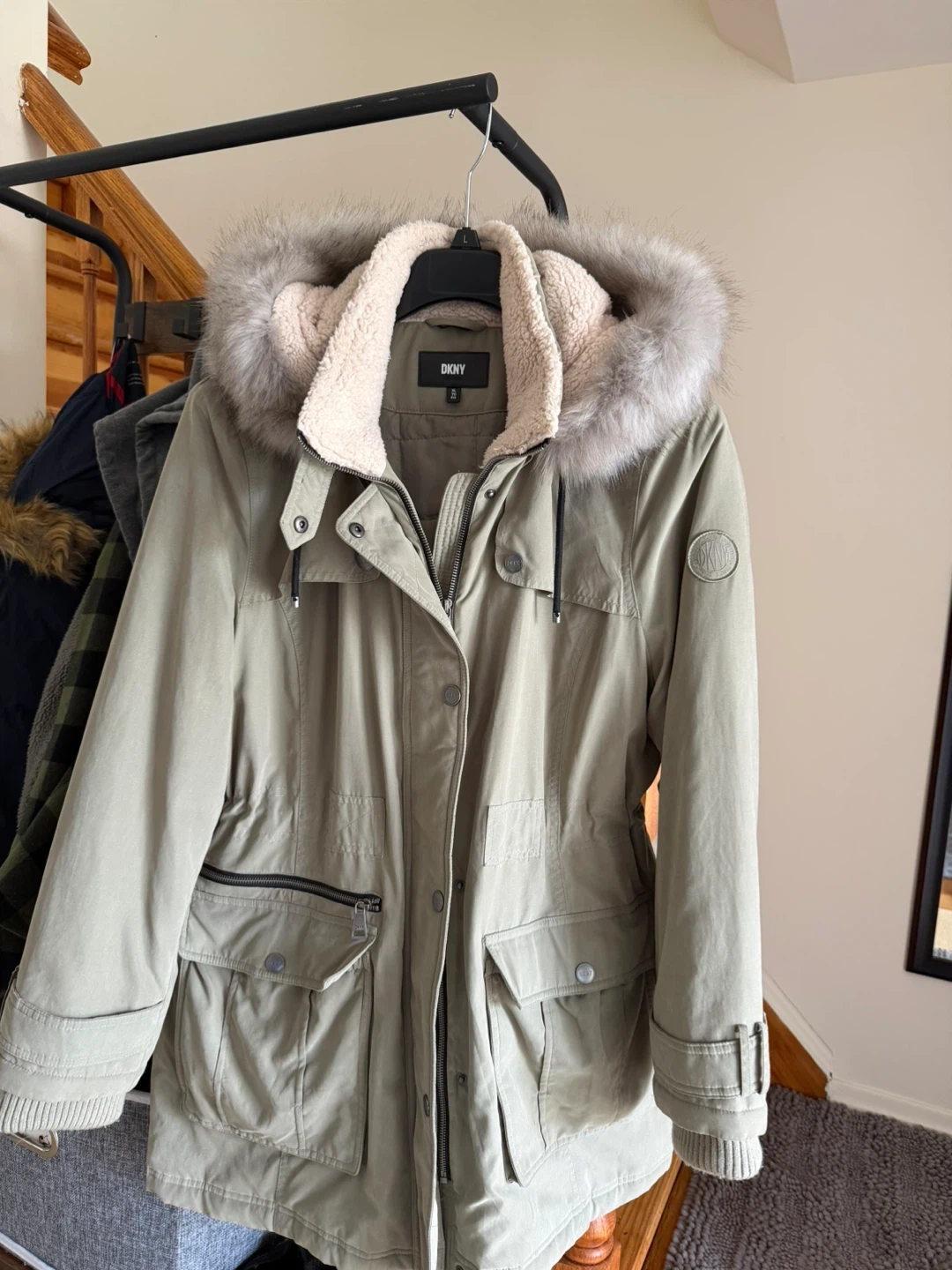 This DKNY parka is green with a faux fur-lined hood. It features a drawstring waist for a customizable fit. It's perfect for staying warm and stylish during colder weather!