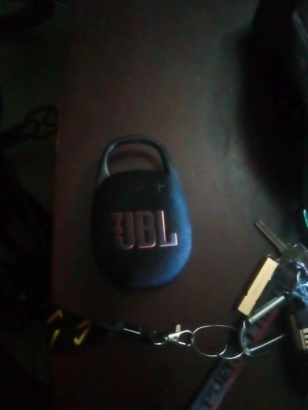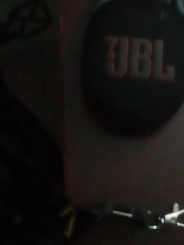 This is a JBLCLIP5 portable speaker. It's black and round. It's great for listening to music on the go!