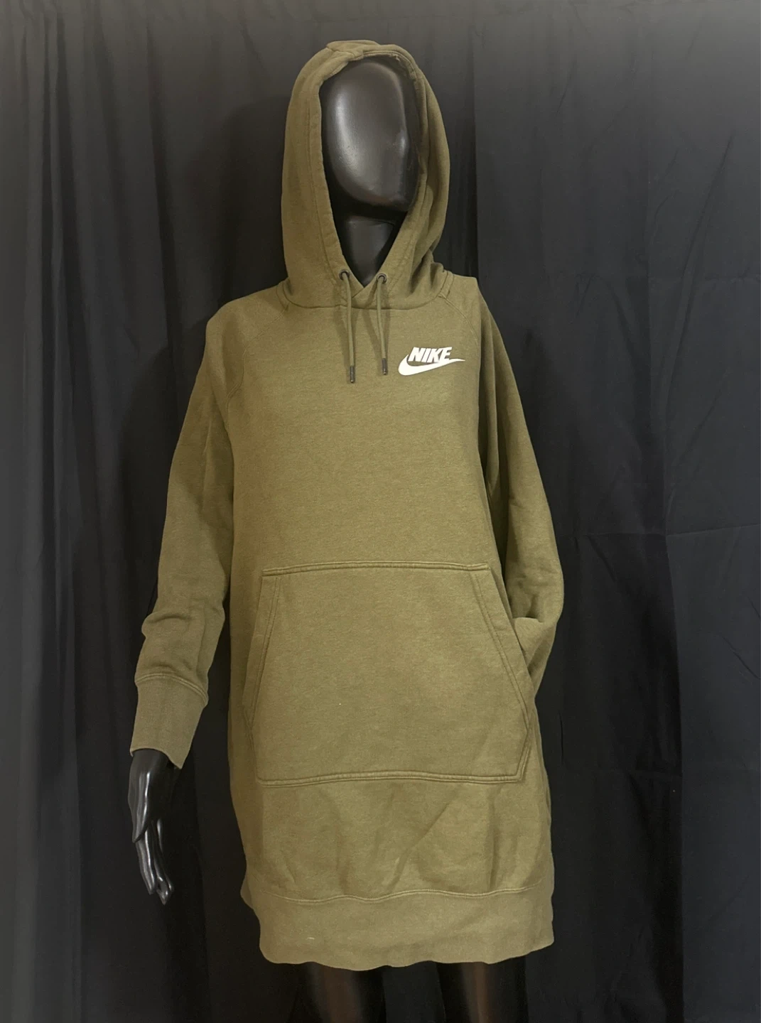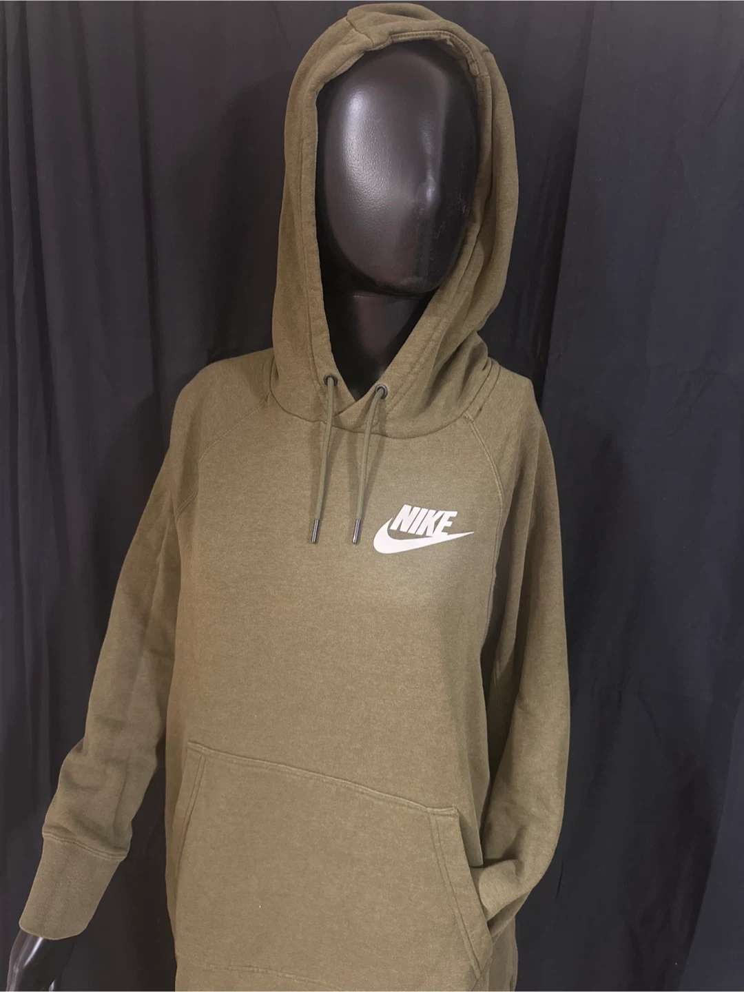Nike hoodie in a classic olive green color. Features a drawstring hood and a front kangaroo pocket. Made from a comfortable blend of cotton and polyester.