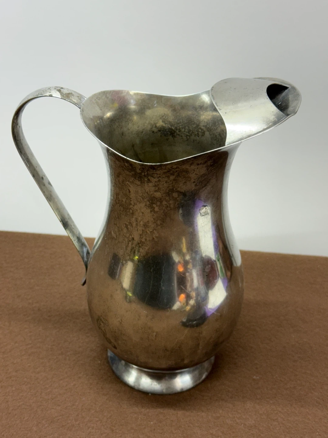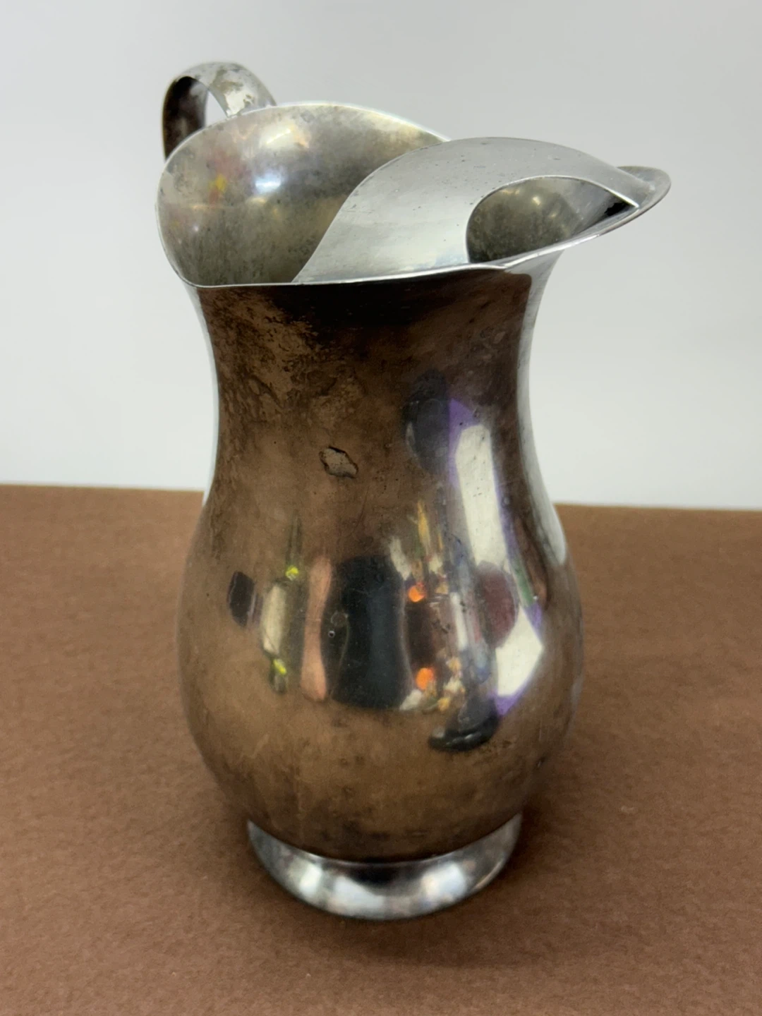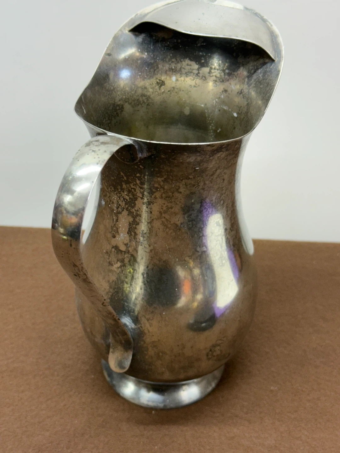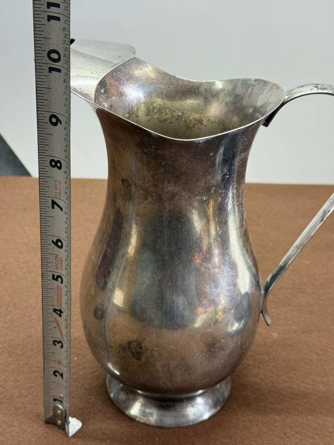 This pitcher has a classic design and a shiny silver finish. It's in fair condition with some tarnish and wear consistent with its age. It's ready for use or display!