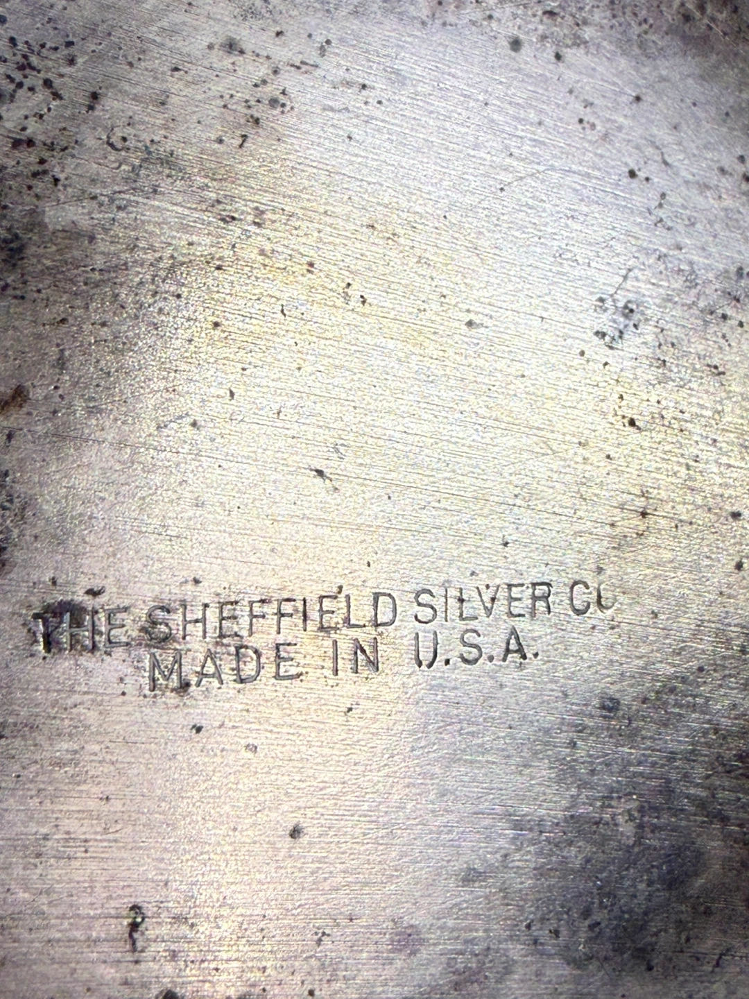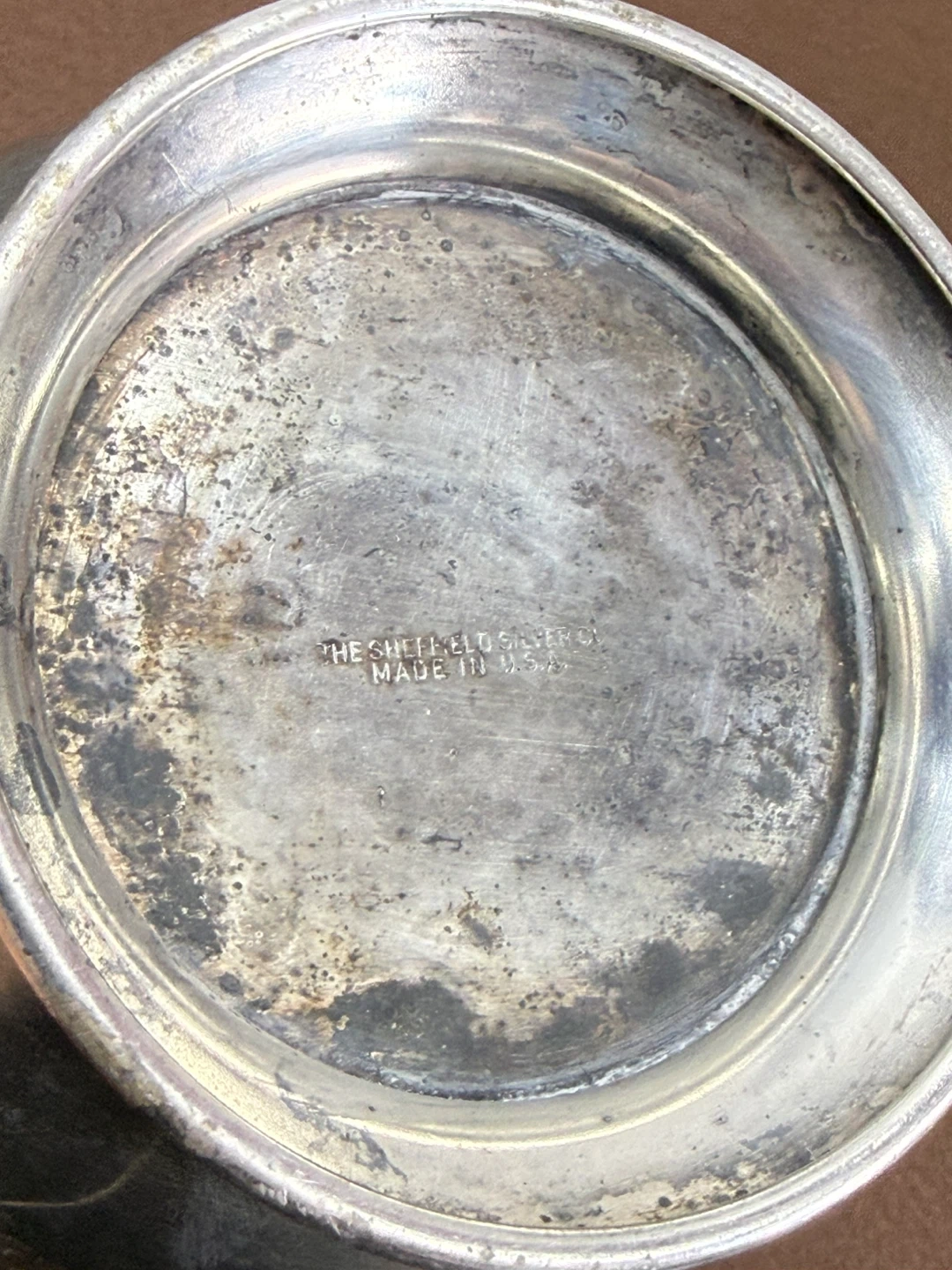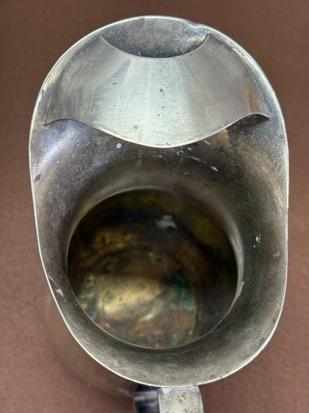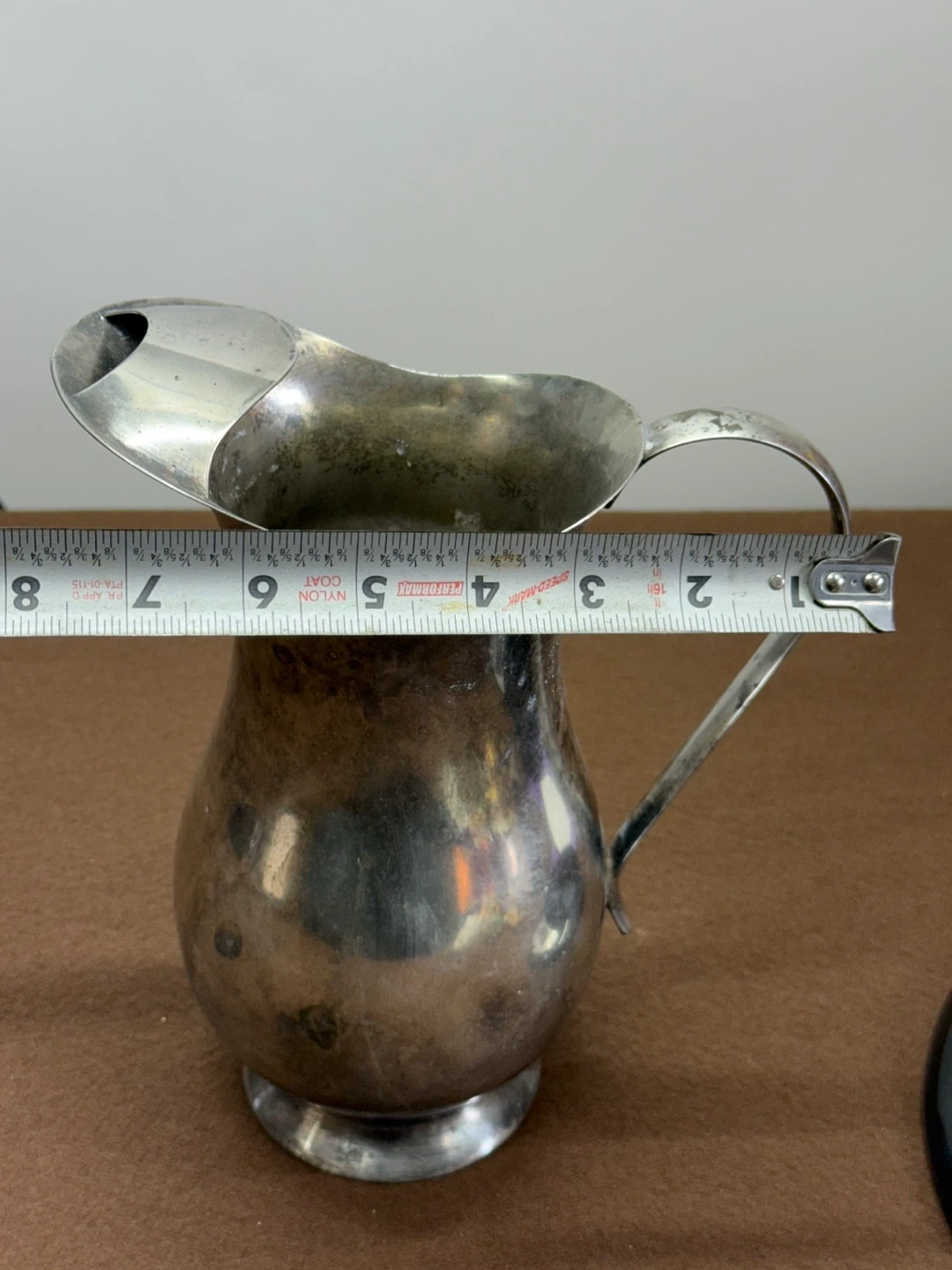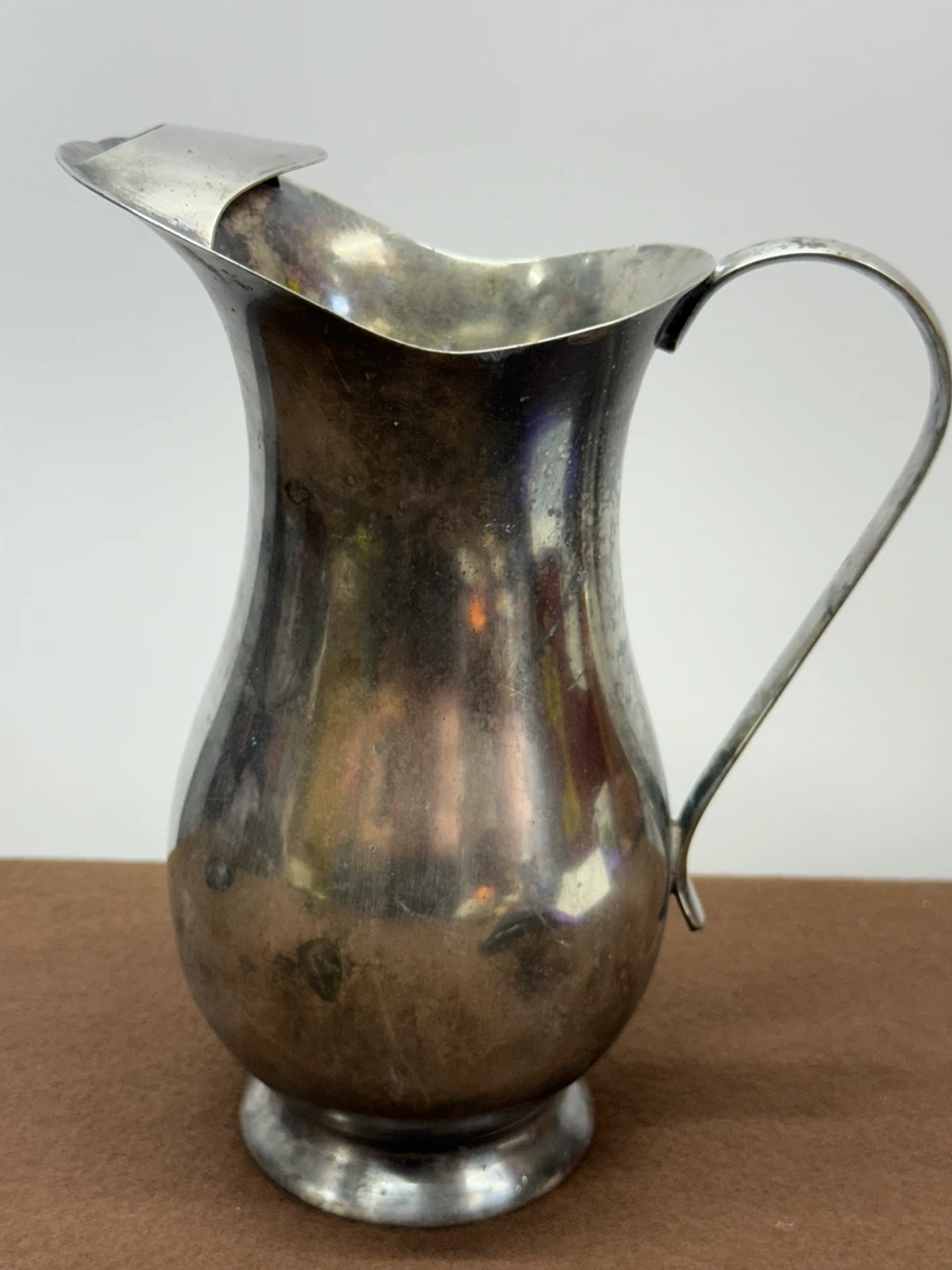 This pitcher has a classic design and a shiny silver finish. It's in fair condition with some tarnish and wear consistent with its age. It's ready for use or display!