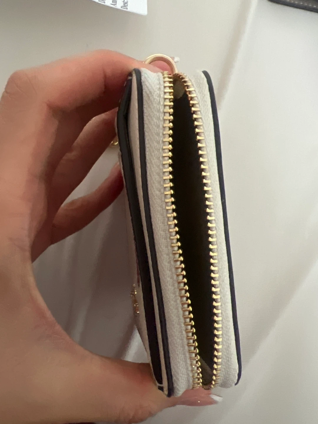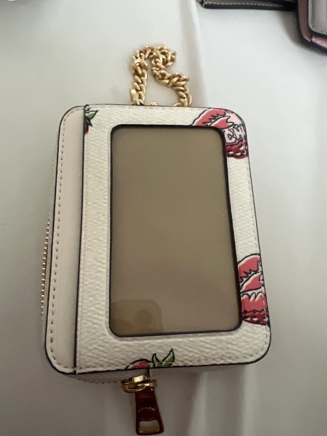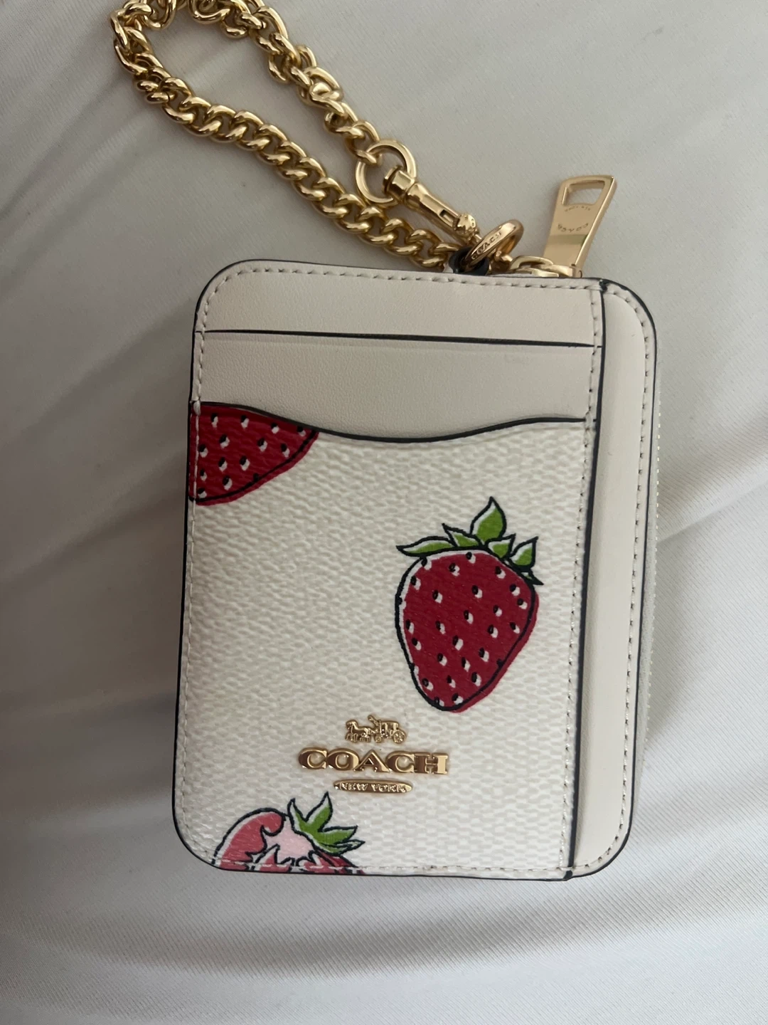 Selling a cute Coach card case with a strawberry print! It's in brand new condition and perfect for carrying your essential cards, has ID clear window. Has a zippered compartment for change or small items and a gold chain. Retails for $118, also selling matching small handbag (dm if interested)