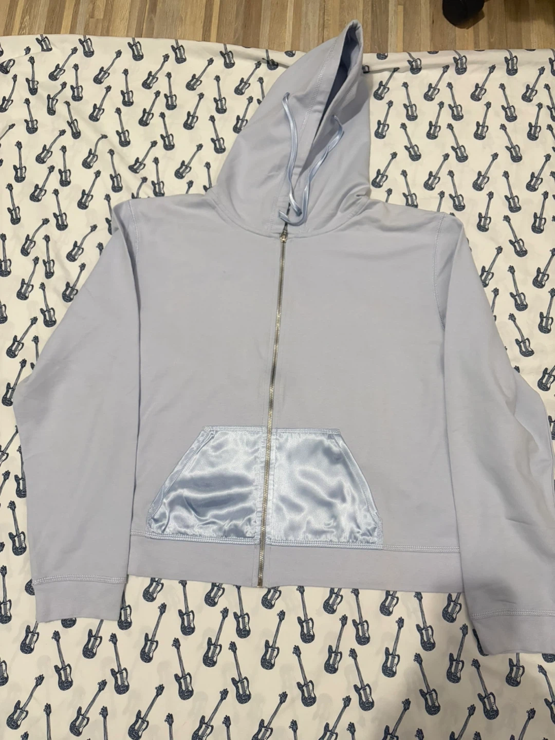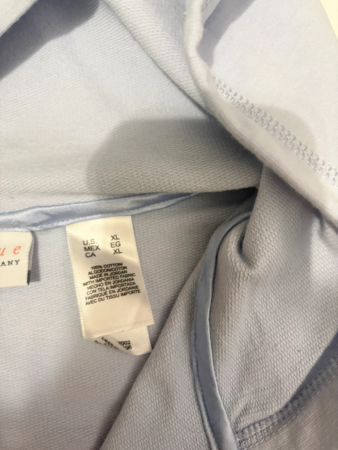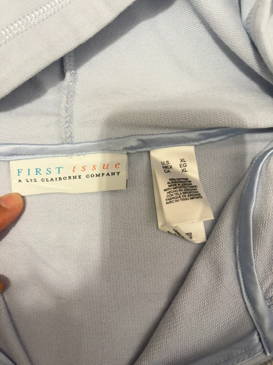 This is a light blue zip-up hoodie by First Issue, a Liz Claiborne Company. It's made of 100% cotton with satin trim on the pocket. Size XL. Great for layering!