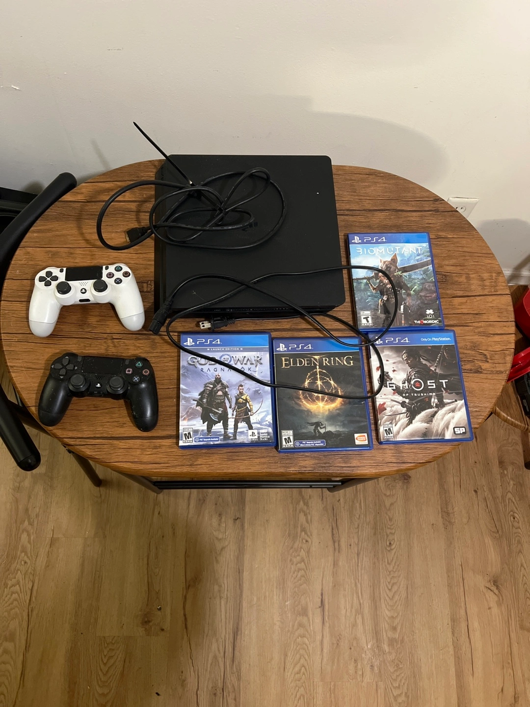 PlayStation 4 Slim console 1 TB two DualShock 4 controllers, and four games: Ghost of Tsushima, Elden Ring, God of War, and biomutant Power cable included and hdmi. Great condition.
