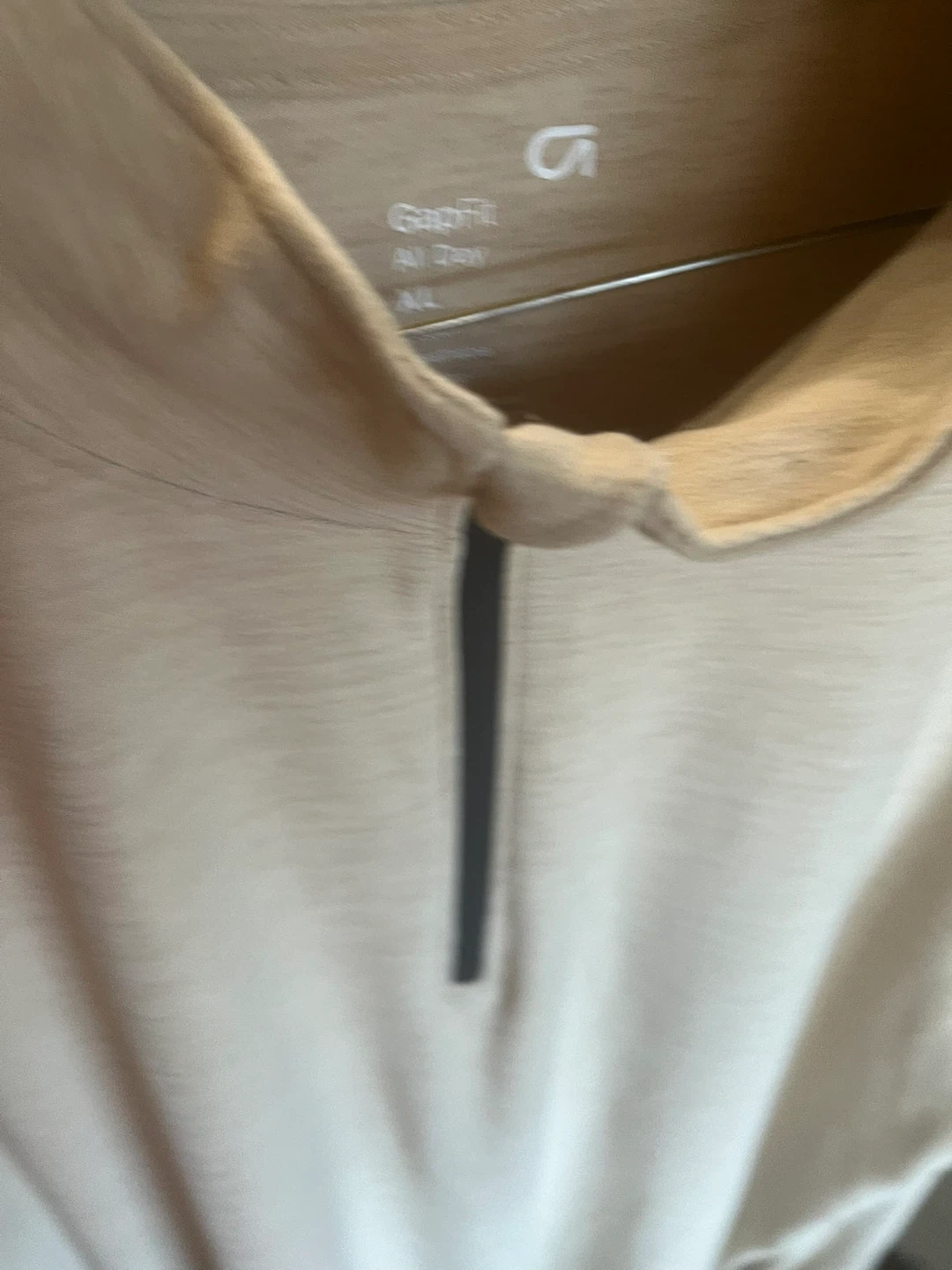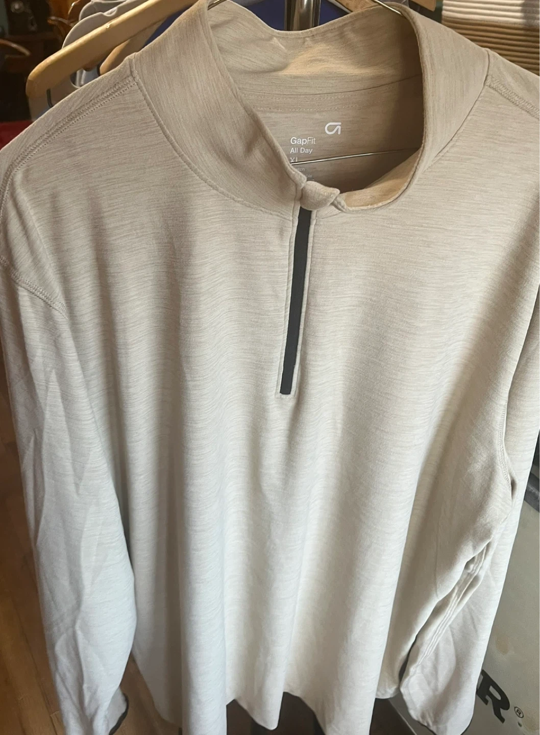 GapFit Men's quarter zip pullover top in a heathered beige color. All Day performance fabric. Size XL. It has a zip neck and long sleeves.