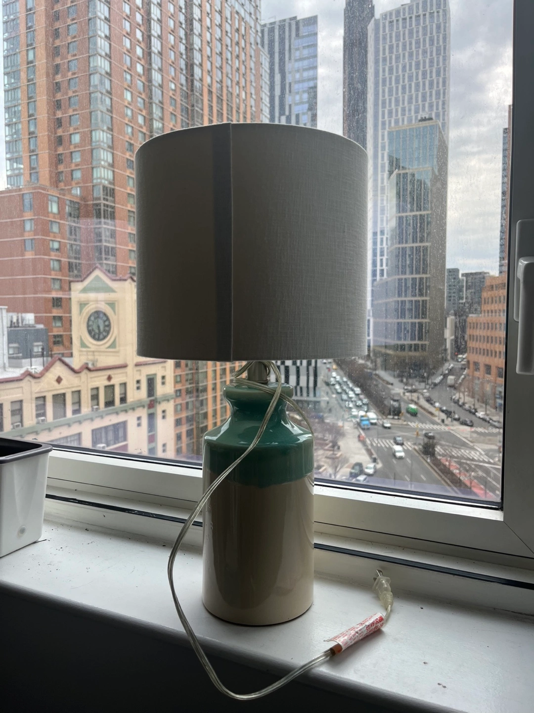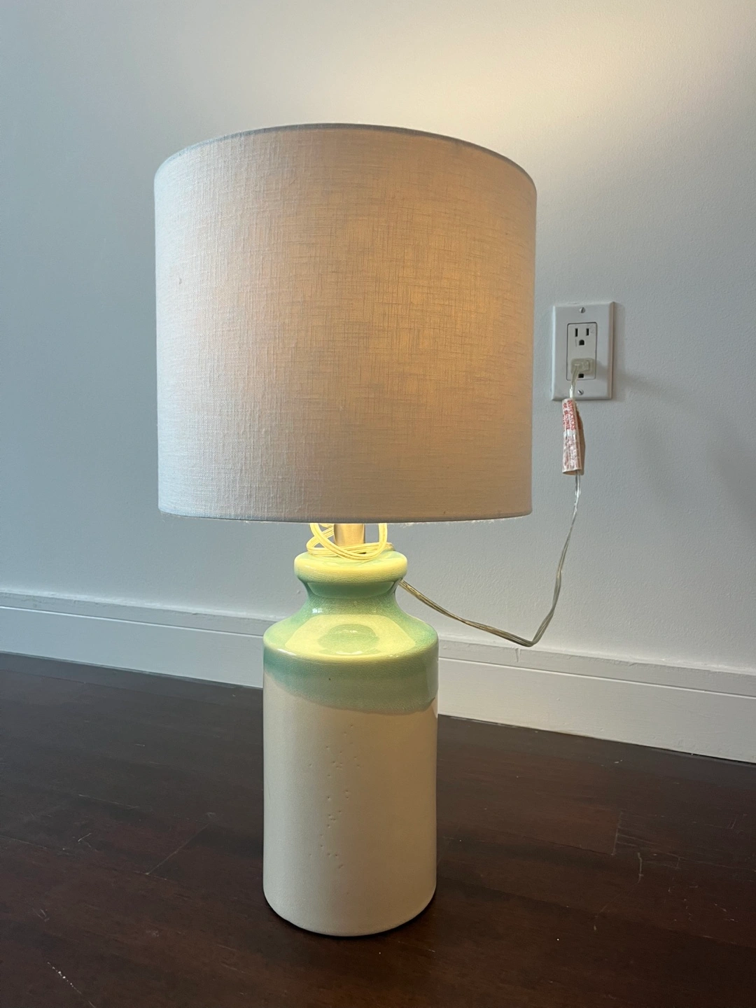 Cute table lamp. Ceramic base, light teal and off-white. Simple white shade. Good condition. Perfect for a bedside table or desk.