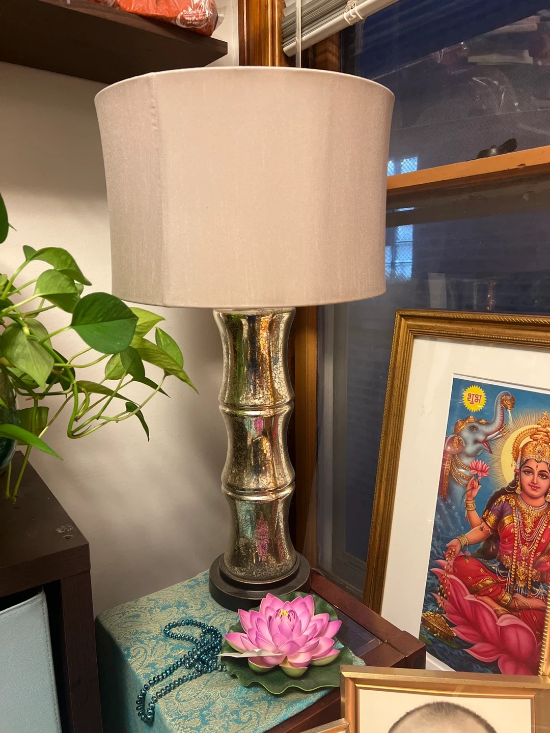 60This is a table lamp with a beige shade and a decorative base. It would look great in any room!