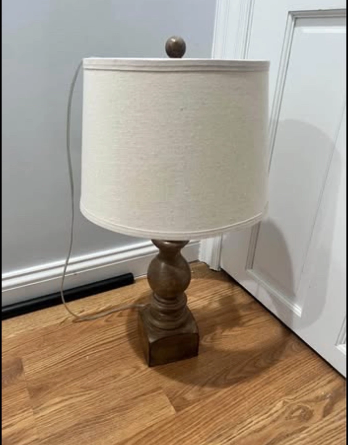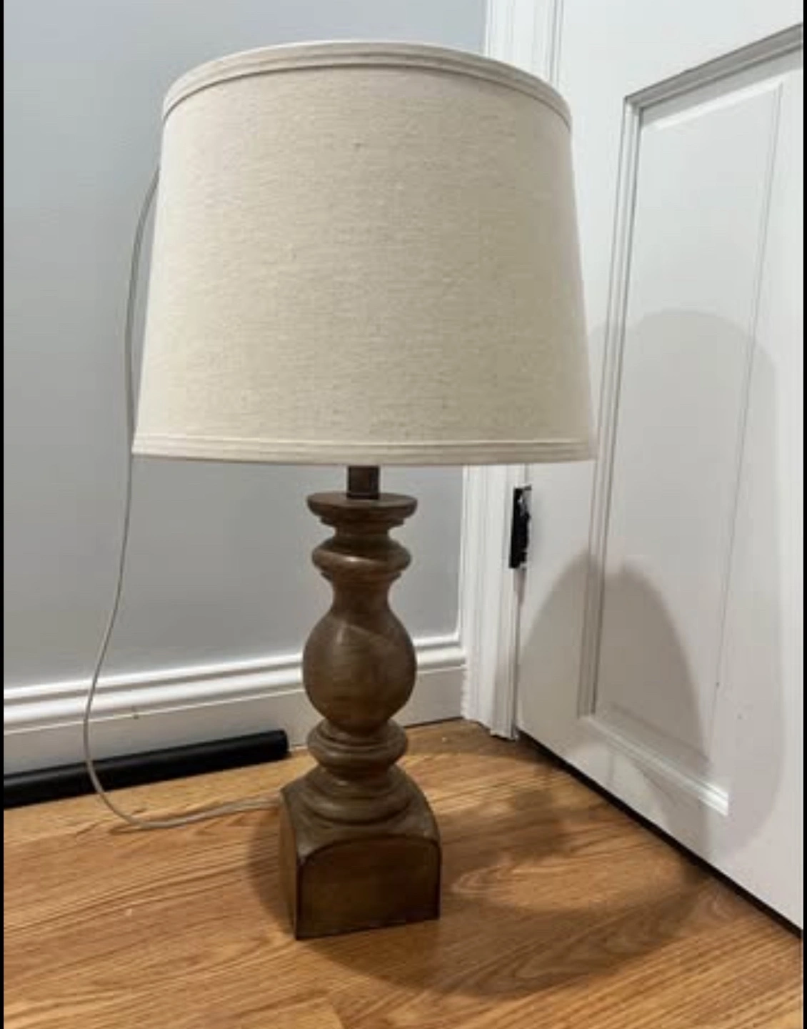 Brown wooden table lamp. Beige fabric shade. Simple design. Great for bedroom or living room.