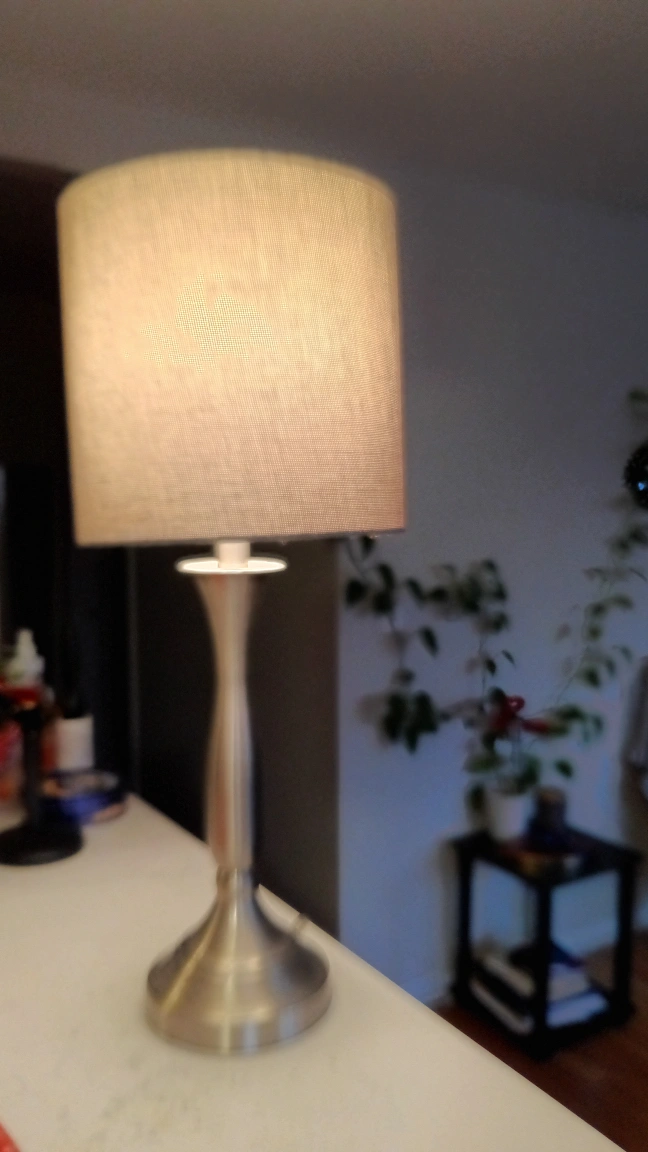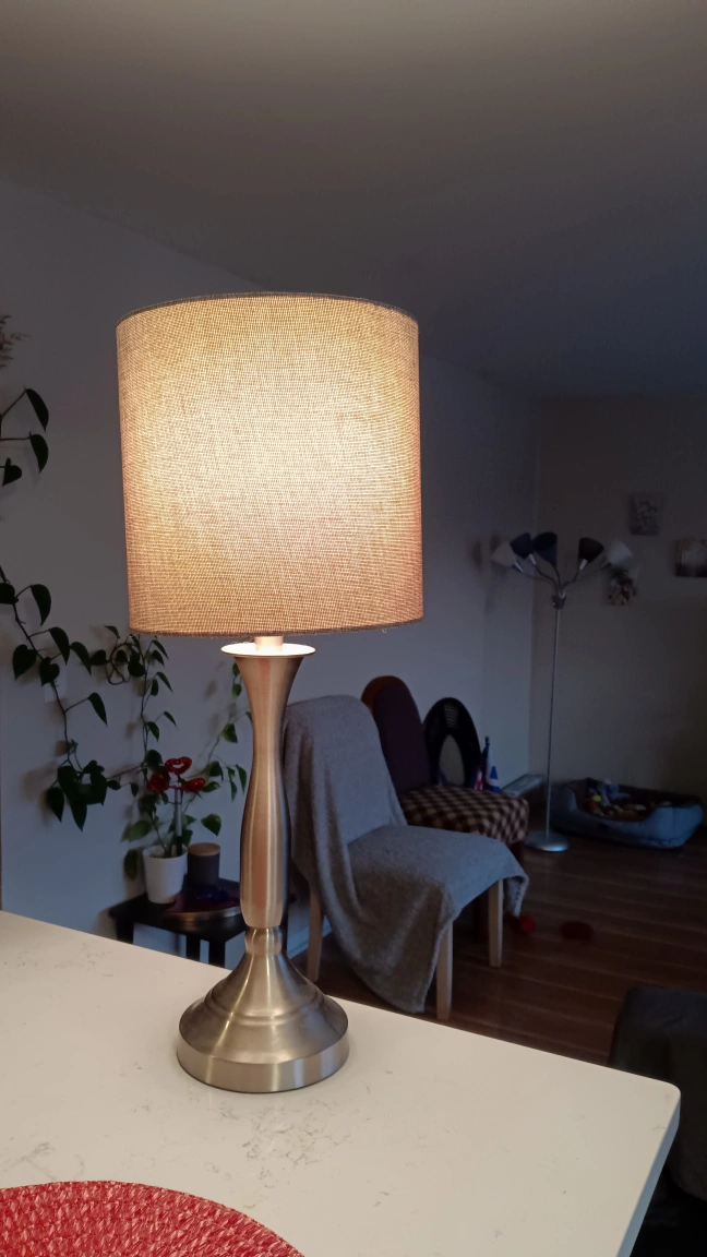 80A table lamp with a fabric shade. The base is metallic. Provides nice warm lighting, perfect for creating a cozy atmosphere. 25 in tall