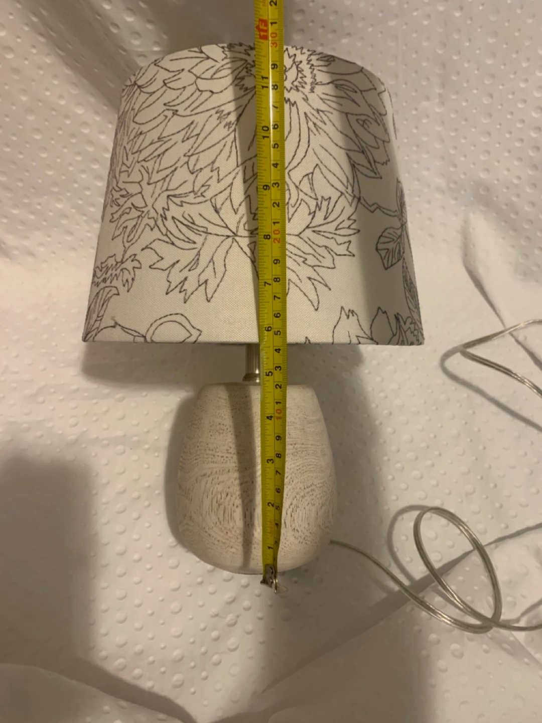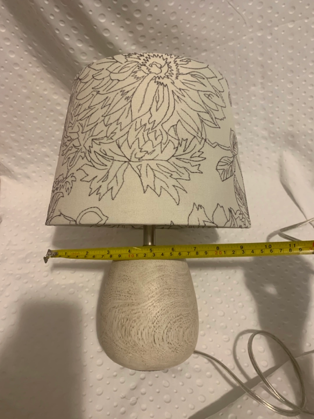 68Here's a cute table lamp that would look great in any room! It features a floral pattern shade and a neutral-toned base. It measures approximately 12 inches tall and 6 inches wide