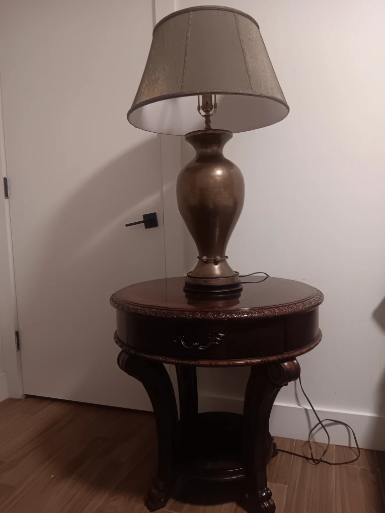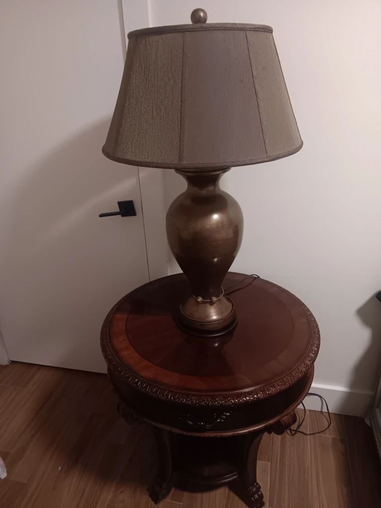 10This is a beautiful table lamp that comes with a round table. The lamp has a classic design with a bronze finish and a neutral-colored lampshade. The table is made of wood with a decorative edge. It would be a great addition to any living room or bedroom