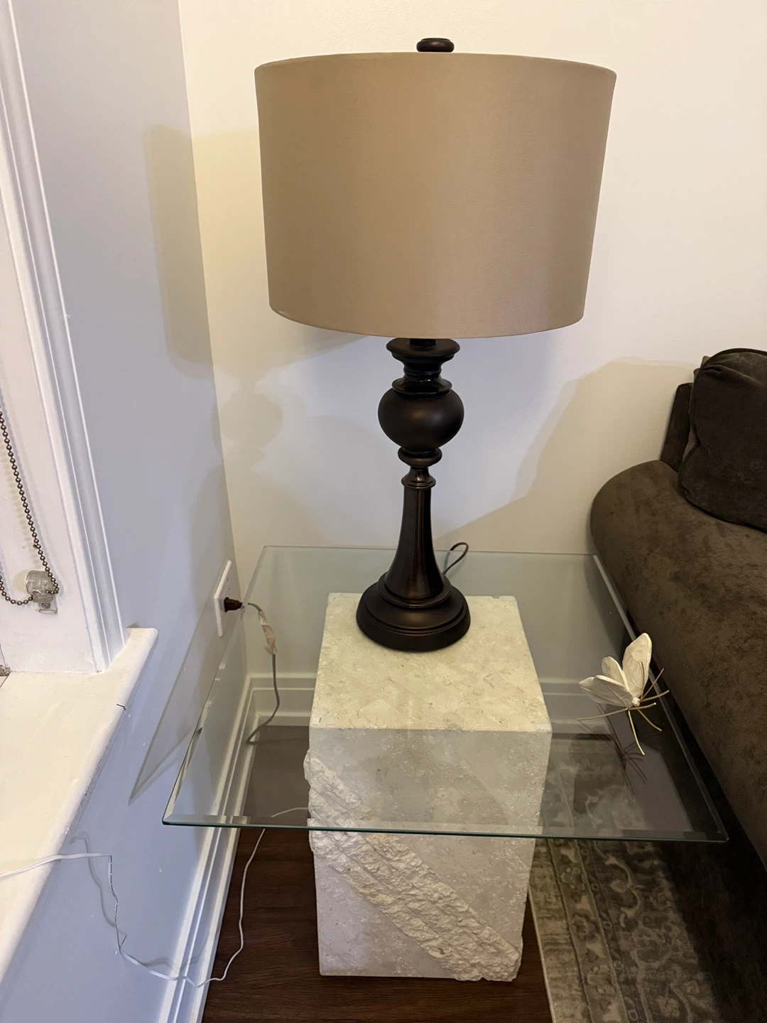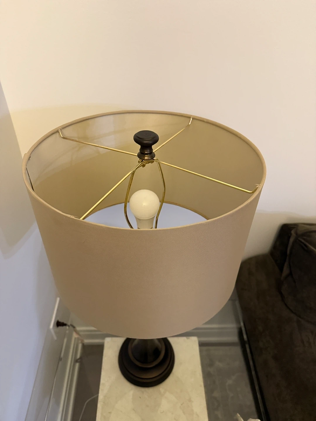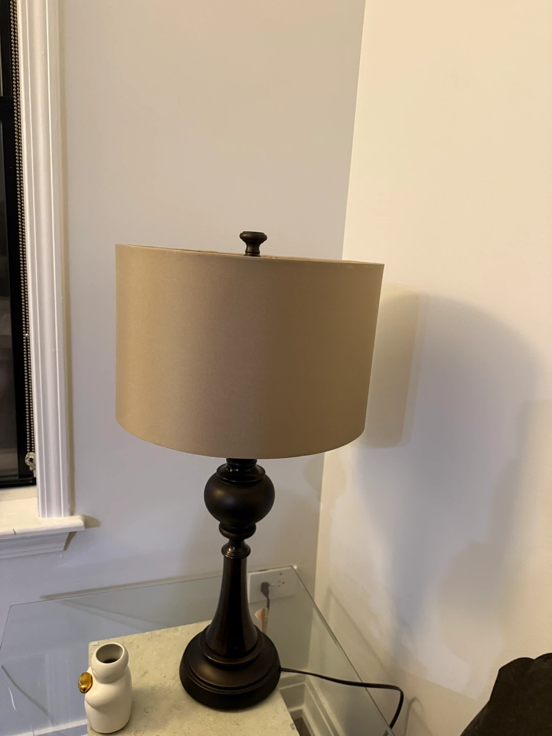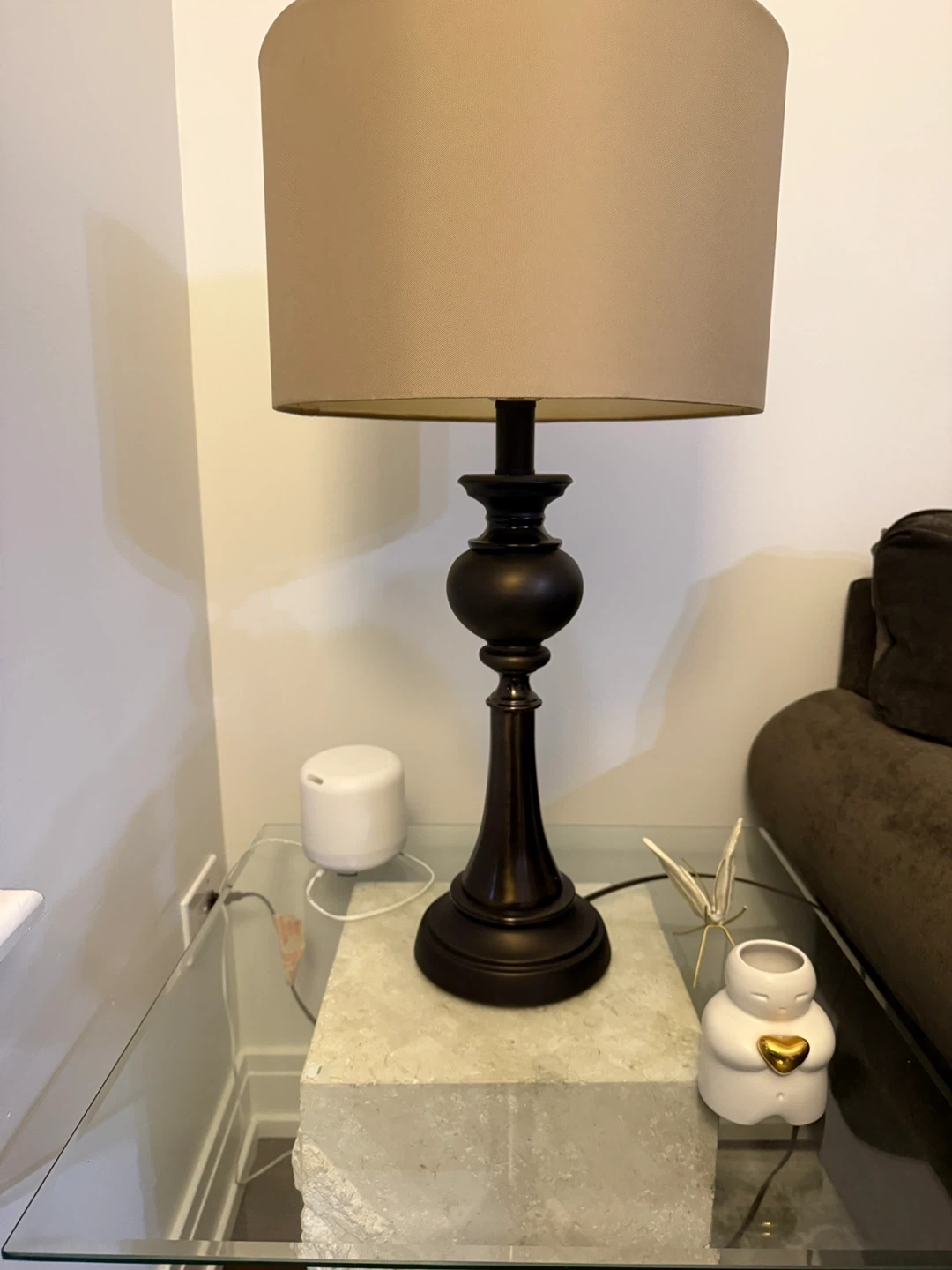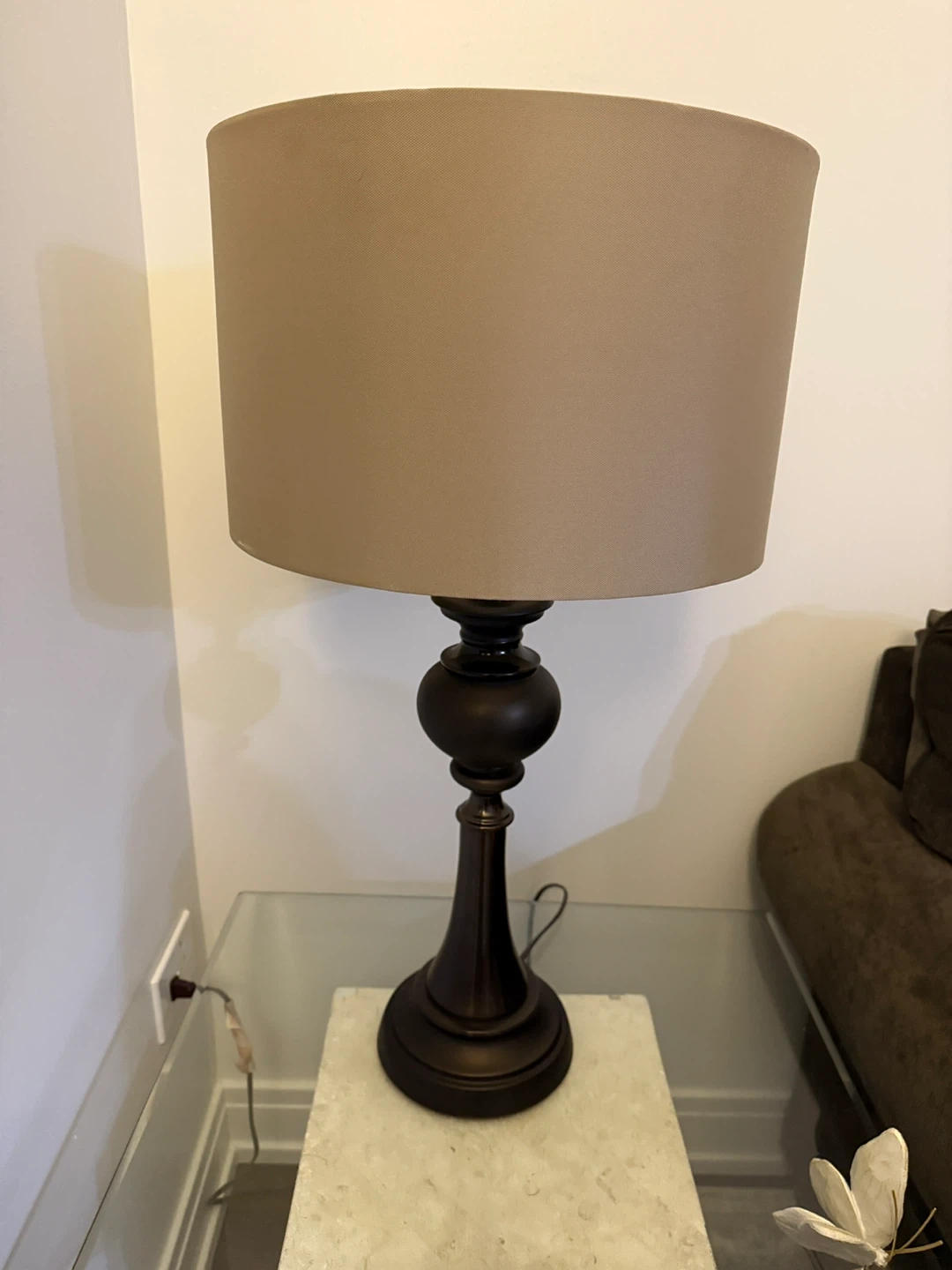 68Selling a table lamp with a tan shade. It has a dark brown base and would look great in any room. The lamp and base are almost in perfect condition, providing a warm, ambient light. Note: Table and ornaments are not included.