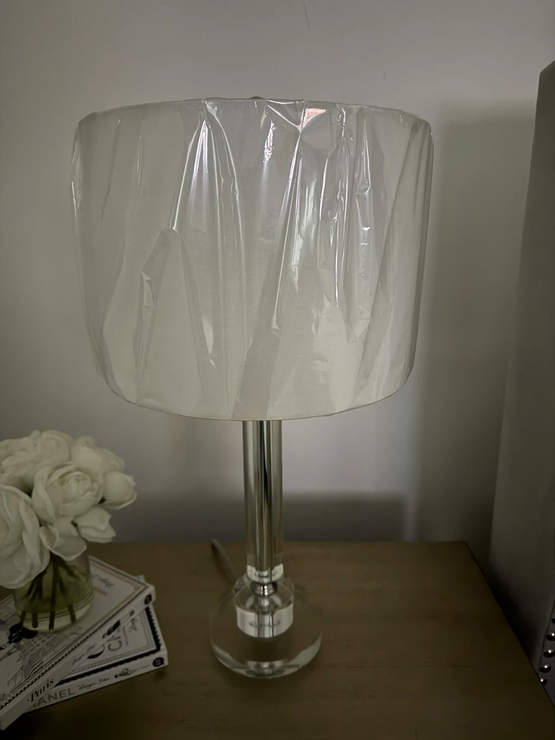 5Selling a table lamp with a white shade. The base appears to be made of clear acrylic and chrome. The lamp is still in its original plastic wrapping, so it is brand new!