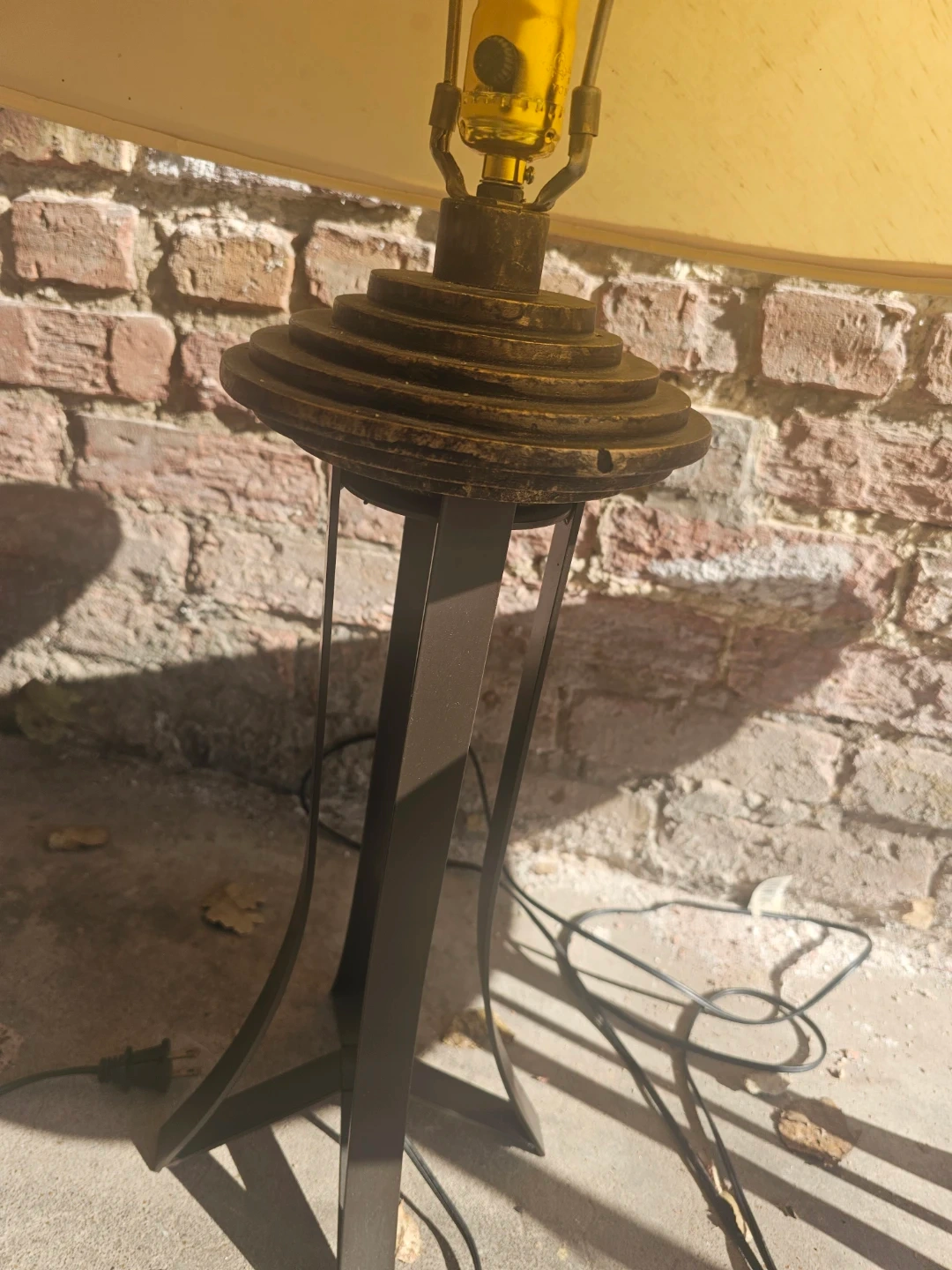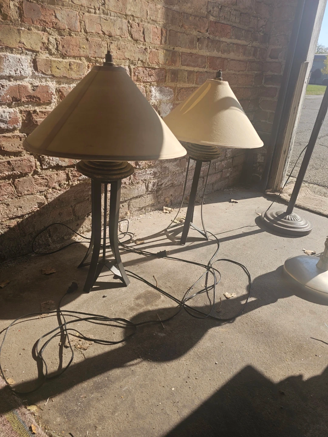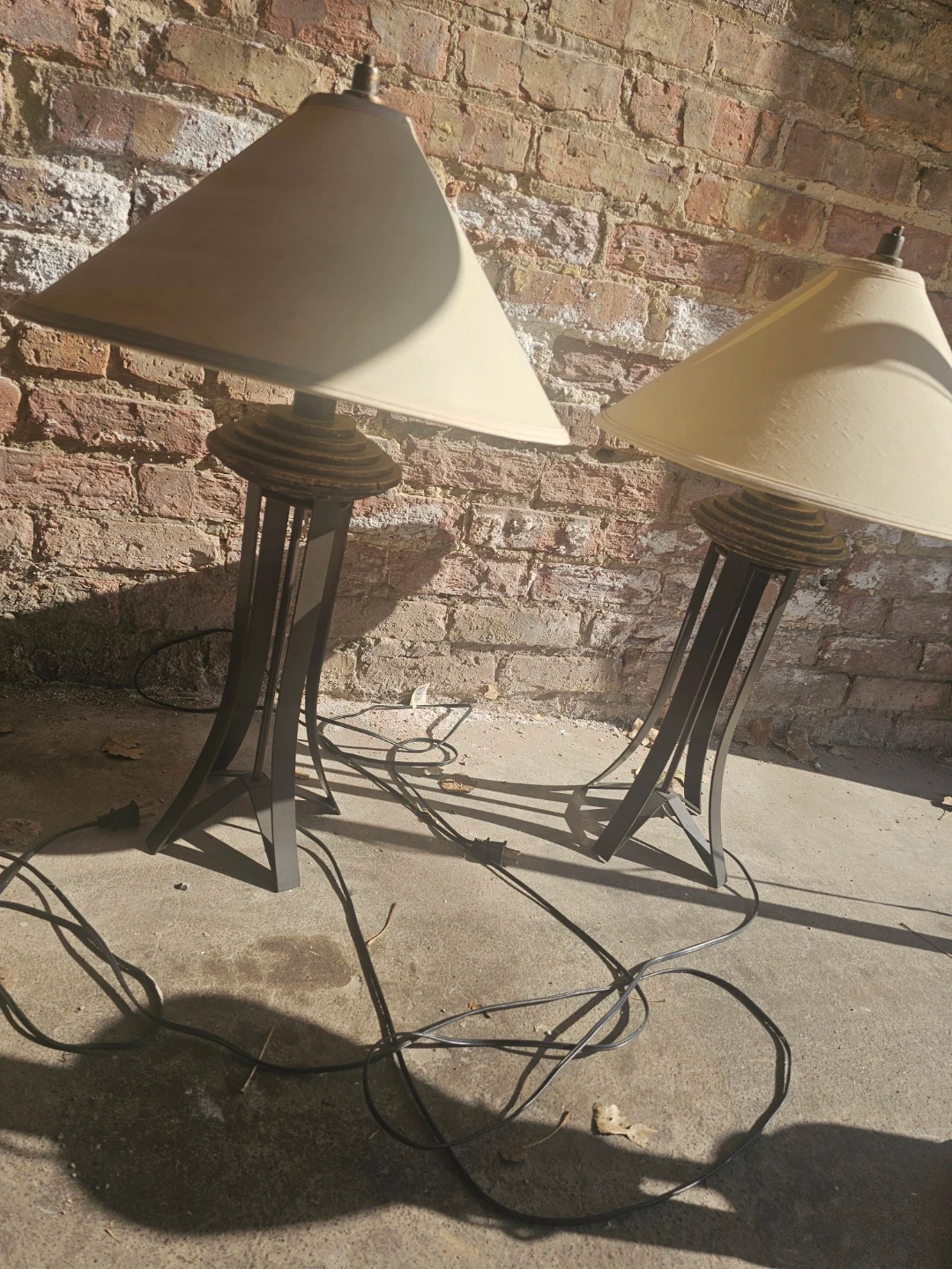 76Selling a set of two table lamps. They have a unique metal design with a tiered base and a classic lampshade. Perfect for adding a touch of elegance to any room!