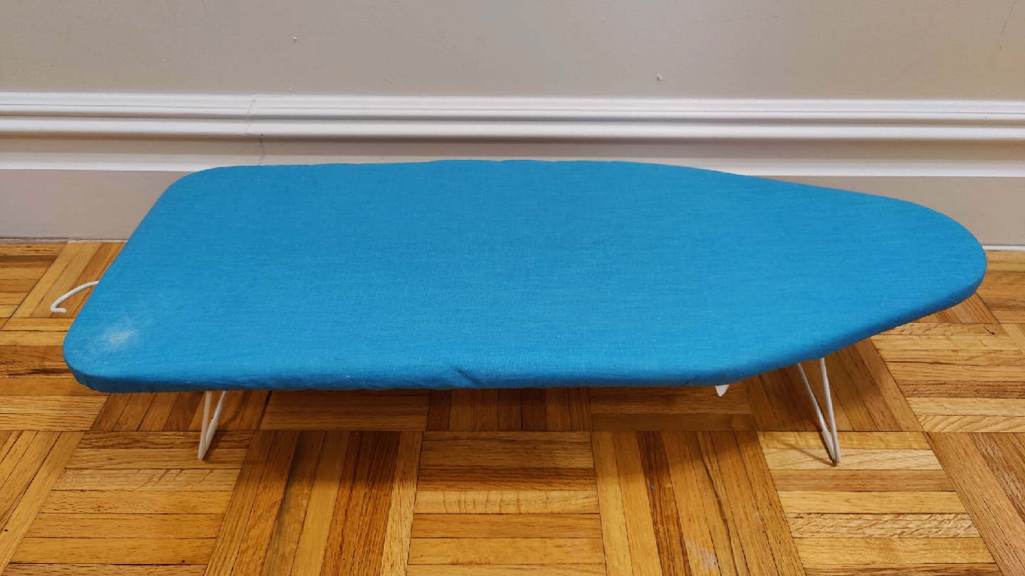 49Selling a tabletop ironing board. It is in good condition and perfect for small spaces or quick ironing jobs. The legs fold down when not in use for easy storage behind a door or inside a closet. The cover is a nice blue color.