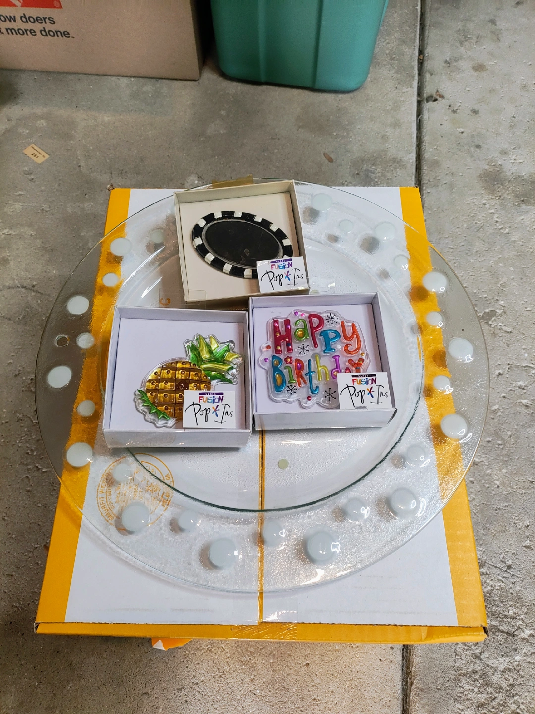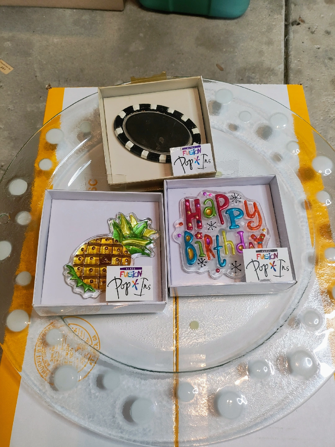 Selling a Tabletop Popin Everyday Round Platter Glass Fusion Silvestri. Originally bought for $50. 3 pop ins included.
