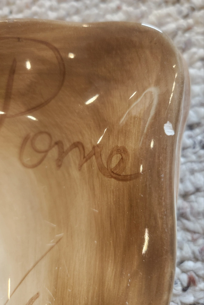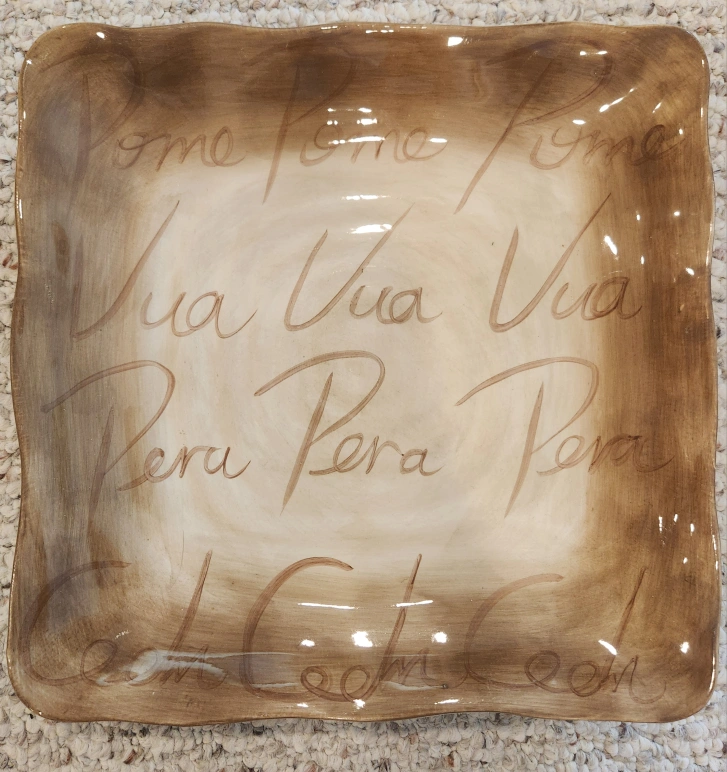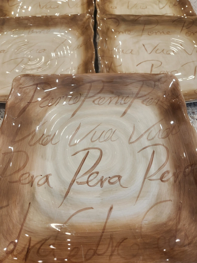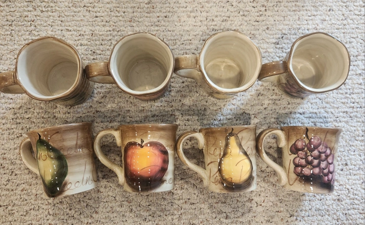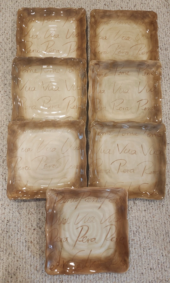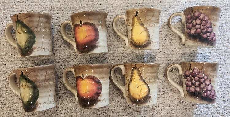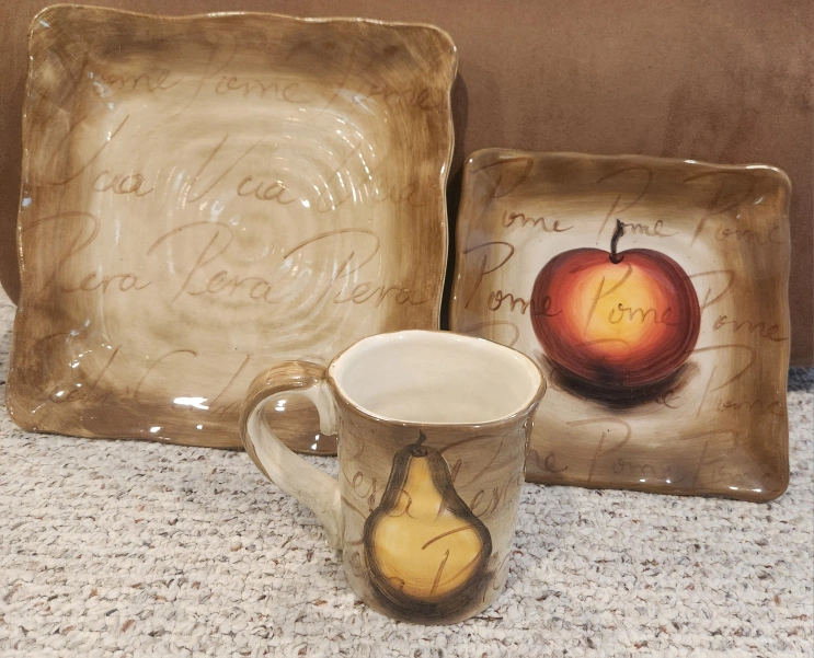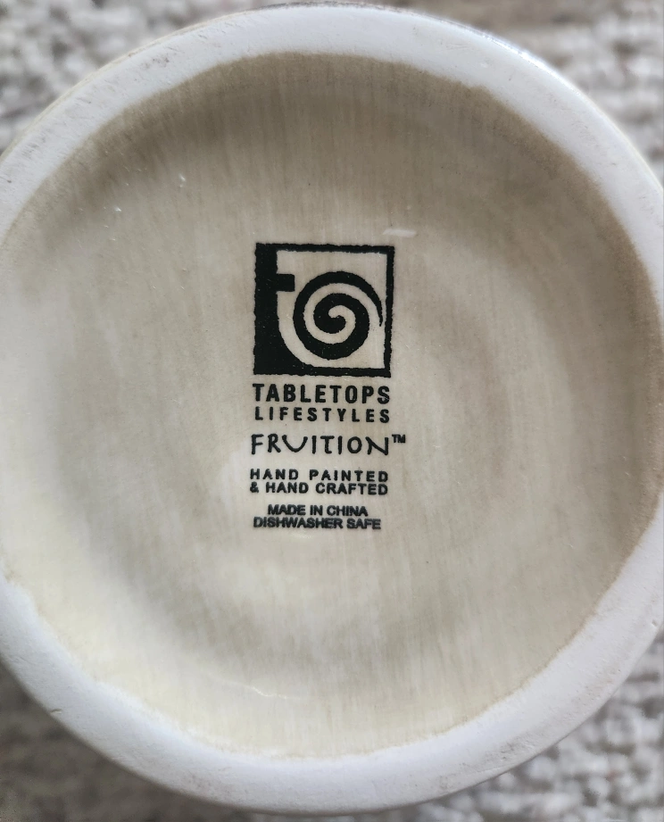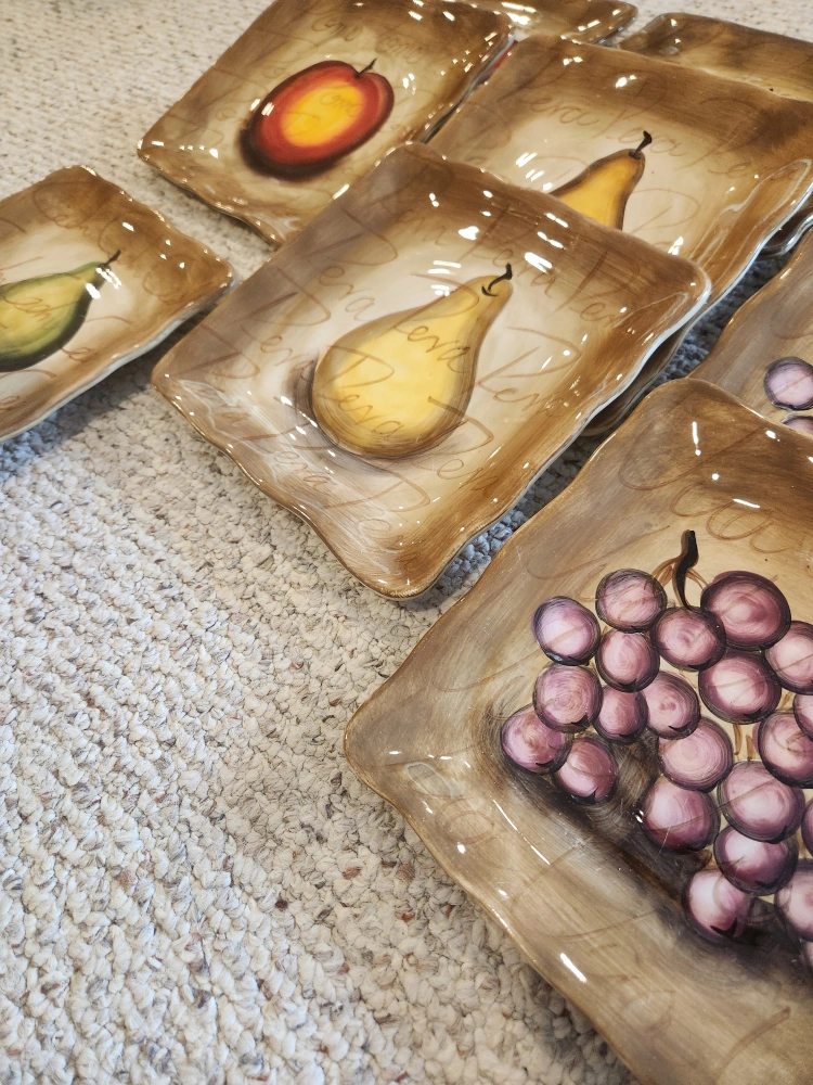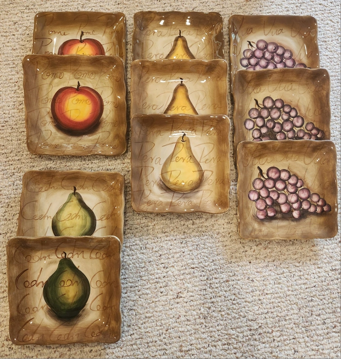 60TableTops Unlimited Fruition Hand Painted Ceramic Dinner Collection. Includes: 7 - Plates 11" 10- Fruit Plates 8.5" 8 - Mugs 4.5" Overall excellent pre-loved condition. Dishwasher safe. As with all pre-loved items, age related wear is expected. Measurements in photos. All money from this sale goes to St Jude.
