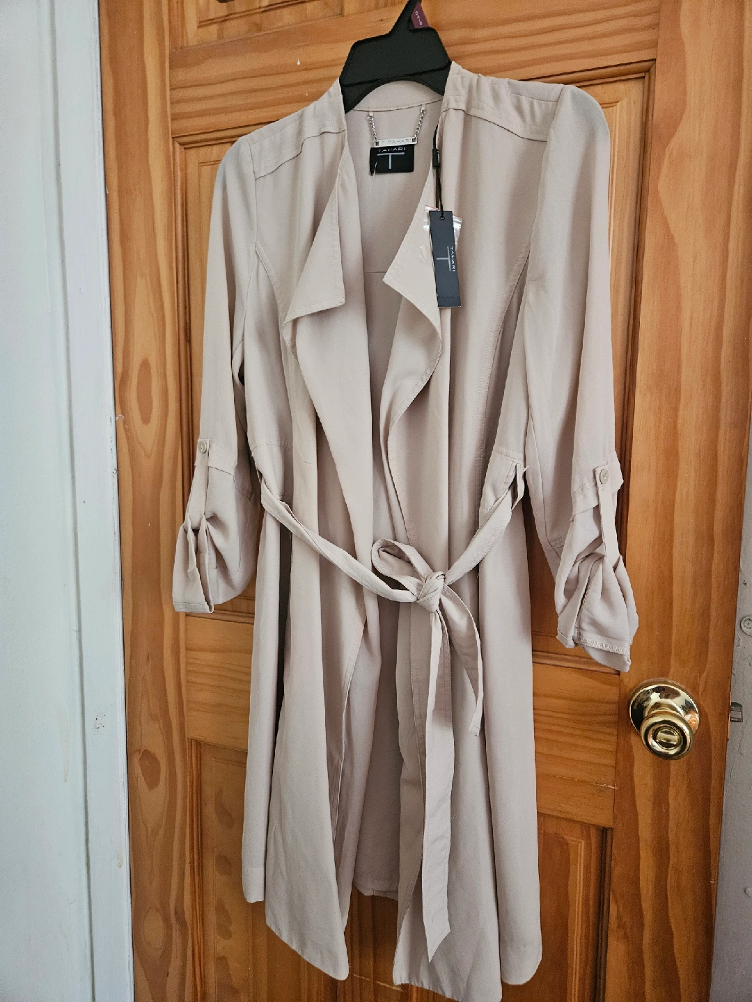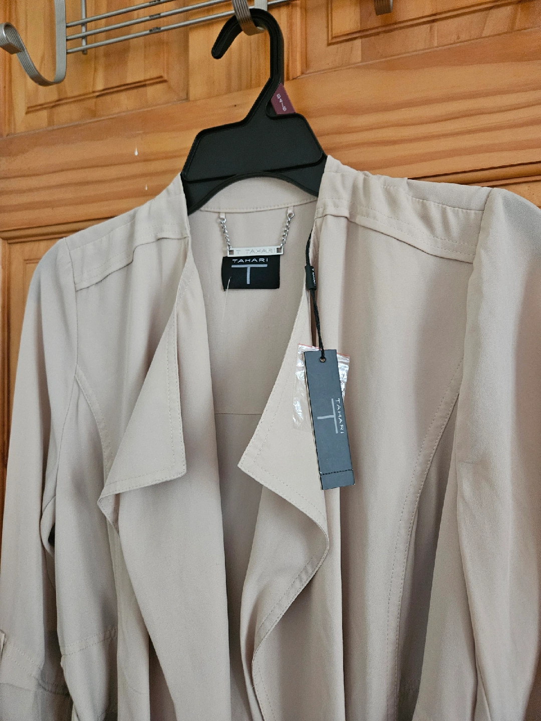 Check out this Tahari trench coat! It's beige and still has the tags on it, so it's brand new. It comes with a belt to cinch the waist. Perfect for layering!