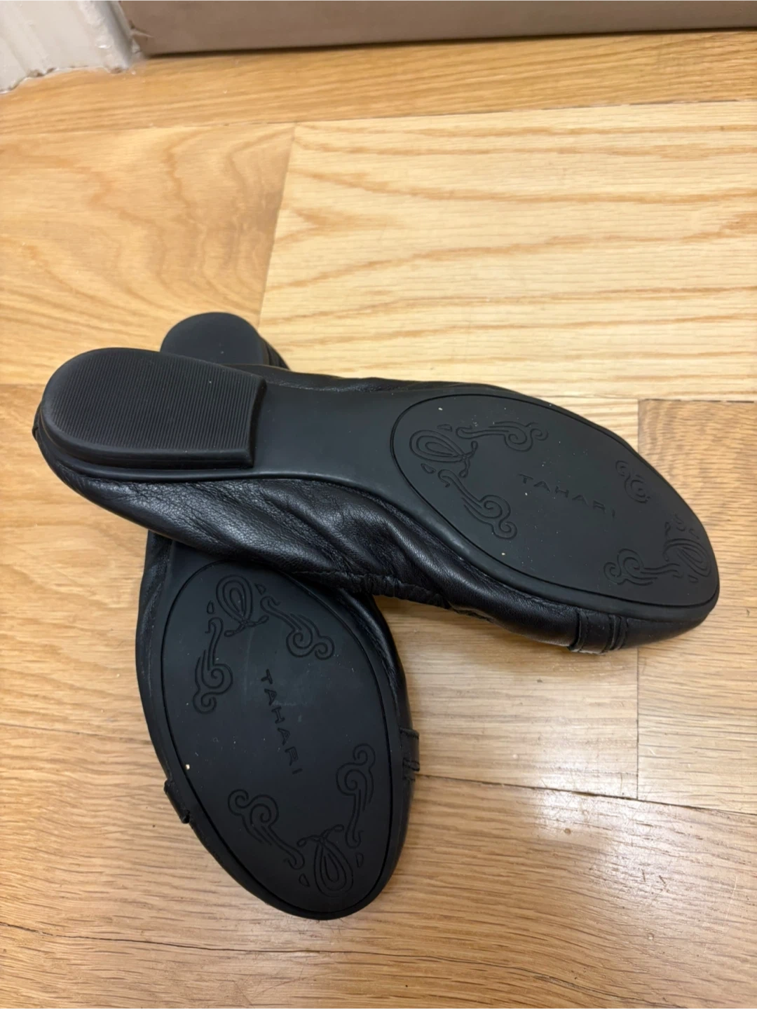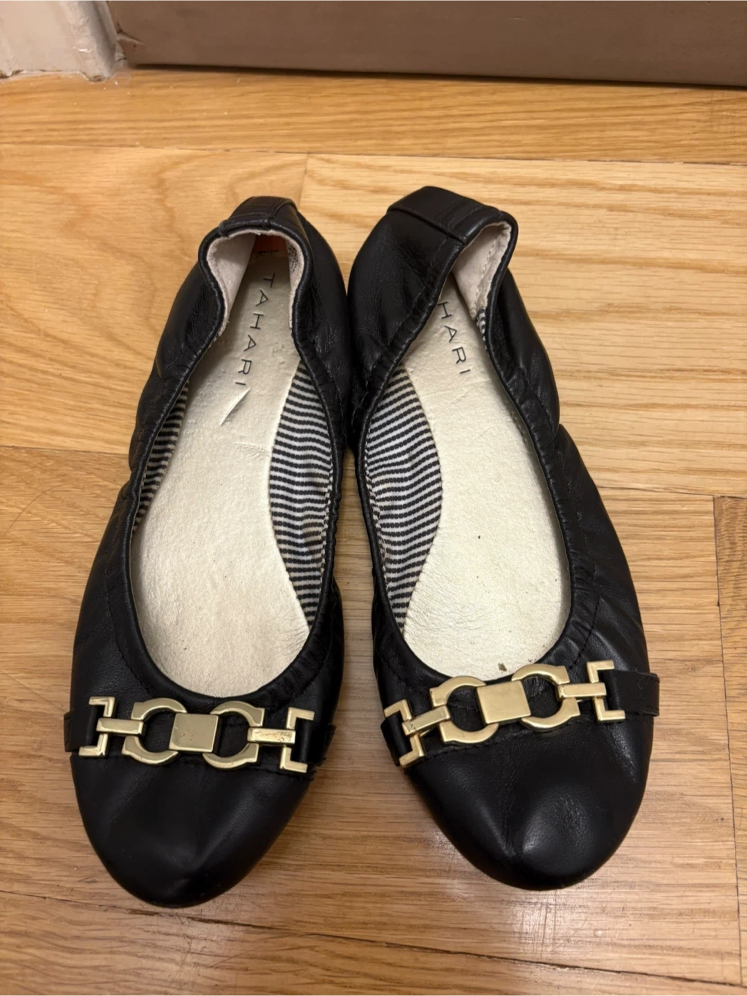 Selling a pair of Tahari ballet flats in black. They are a size 7 and in great condition! These stylish flats feature a gold-tone accent across the toe. Perfect for everyday wear!