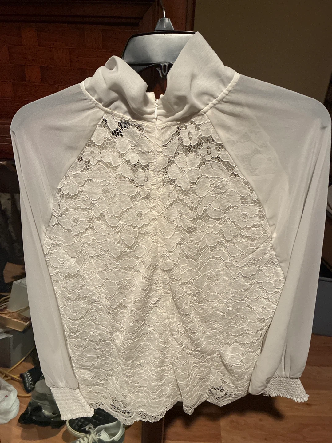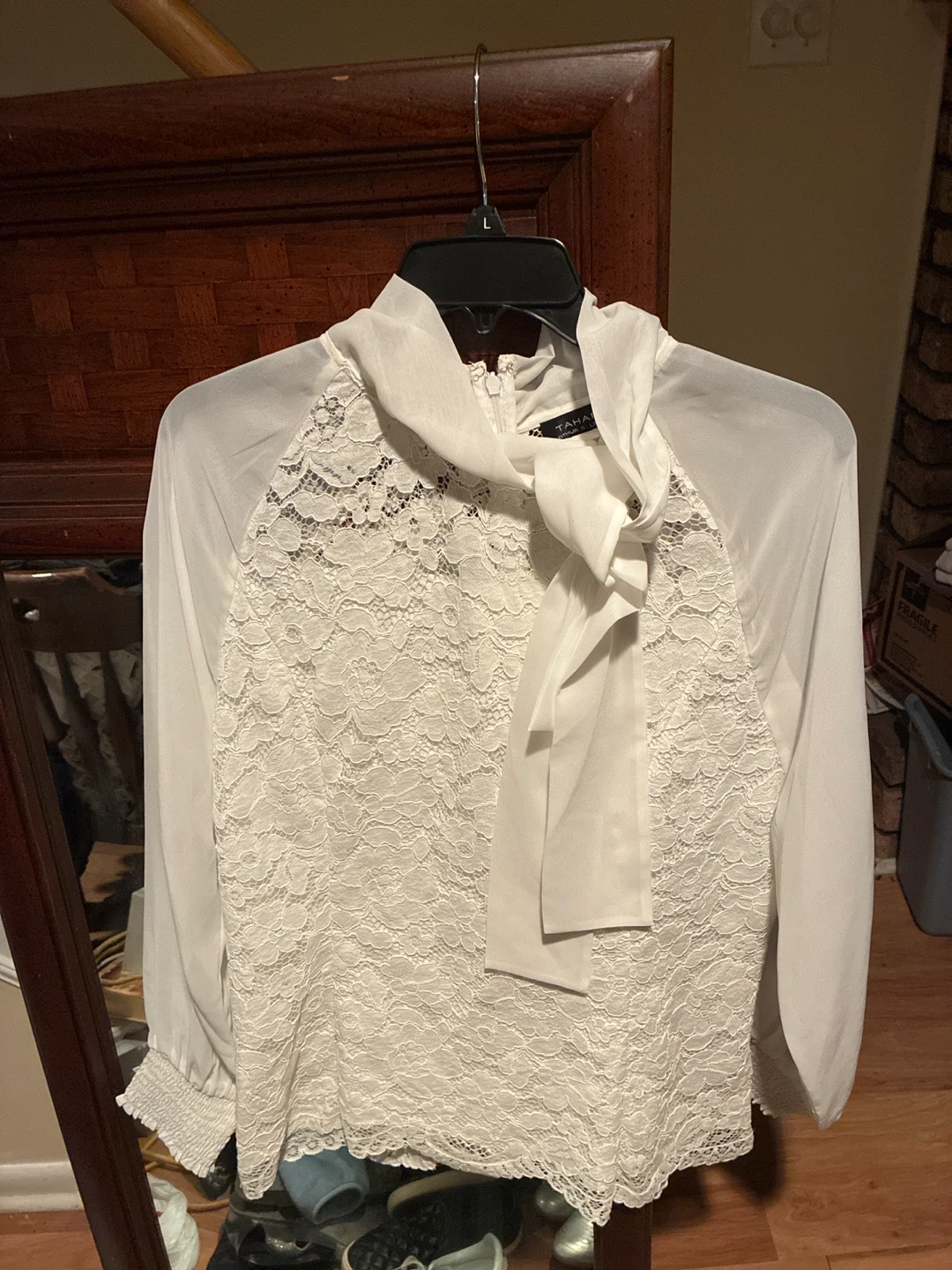 10Elegant Tahari white blouse with delicate lace detailing! This blouse is a size large and features a stylish design. Perfect for dressing up or down, it's a versatile addition to any wardrobe