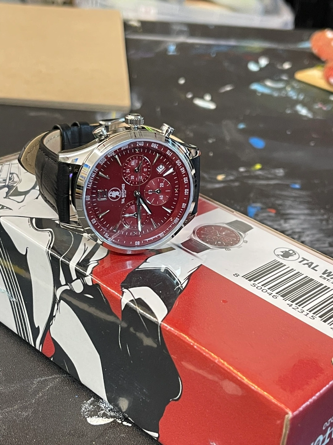 273Selling a stylish TAL Watches chronograph watch with a burgundy face and a black leather band. It comes with its original box! The watch features a stainless steel back and is water-resistant. Perfect for adding a touch of sophistication to your look