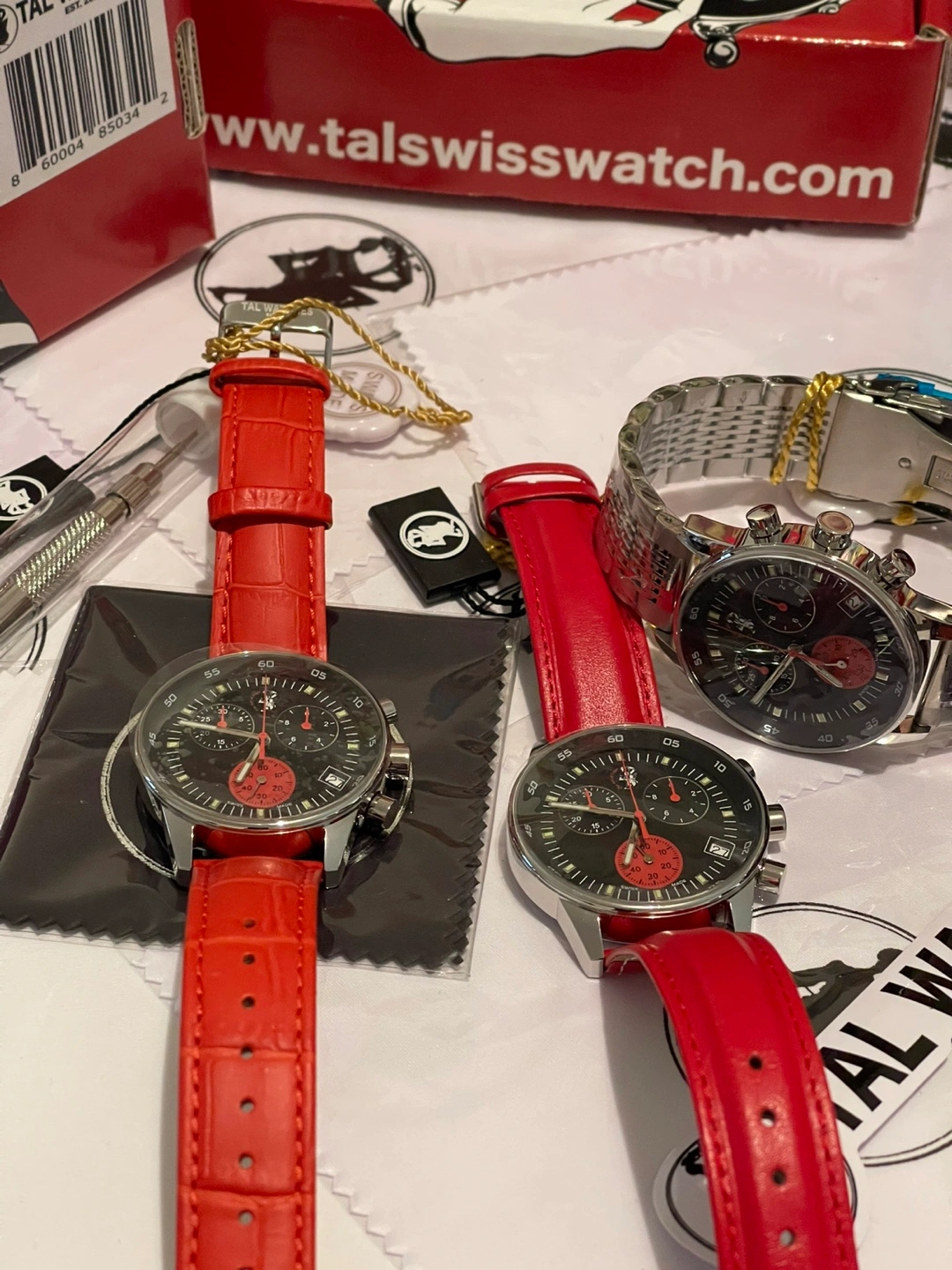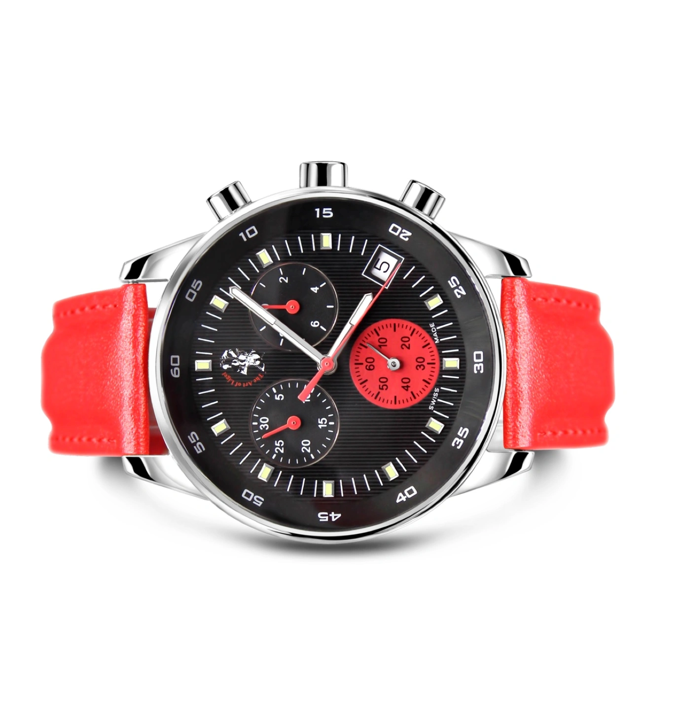 273Watch with a black face. It has a red leather band. It has a few smaller dials and indices on the face, as well as a date window. The watch would look great while you’re out and about.