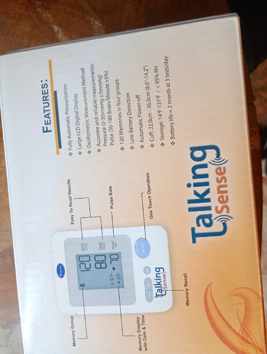 Selling a Talking Sense blood pressure monitor! It's fully automatic and has a large LCD digital display. Cuff size is 22.0cm - 36.0cm (8.5"-14.2"). It also has automatic power-off and memory recall features. The box includes instructions