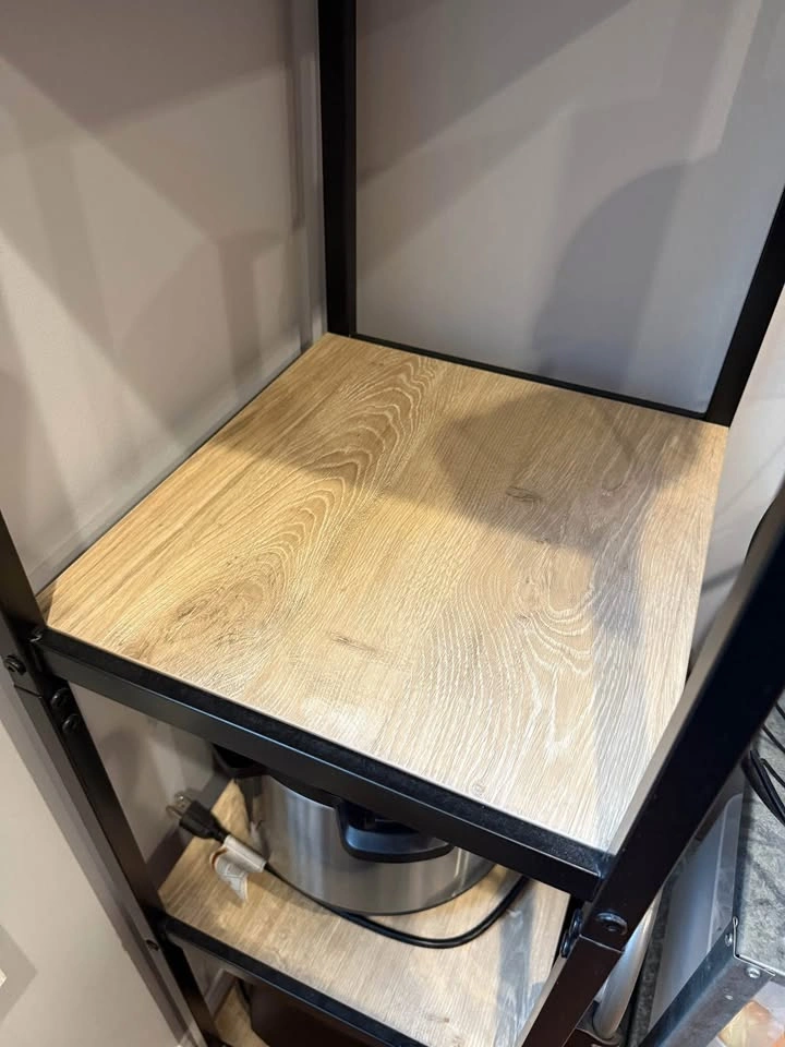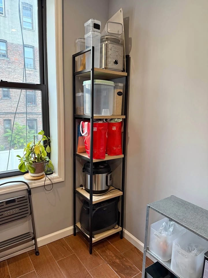 Pantry shelf in excellent condition. 5 tiers. Dimensions: 16" W x 13.5" D x 6' H Height between shelves: 14" You'll need 2 people to carry it down one flight of stairs