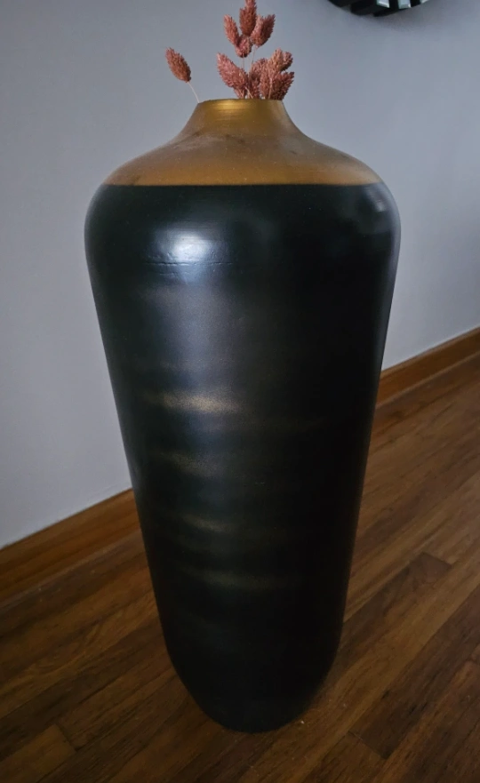 Selling a tall decorative vase with a black and gold finish. It's perfect for adding a touch of elegance to any room. The vase is in great condition and ready to hold your favorite flowers or greenery