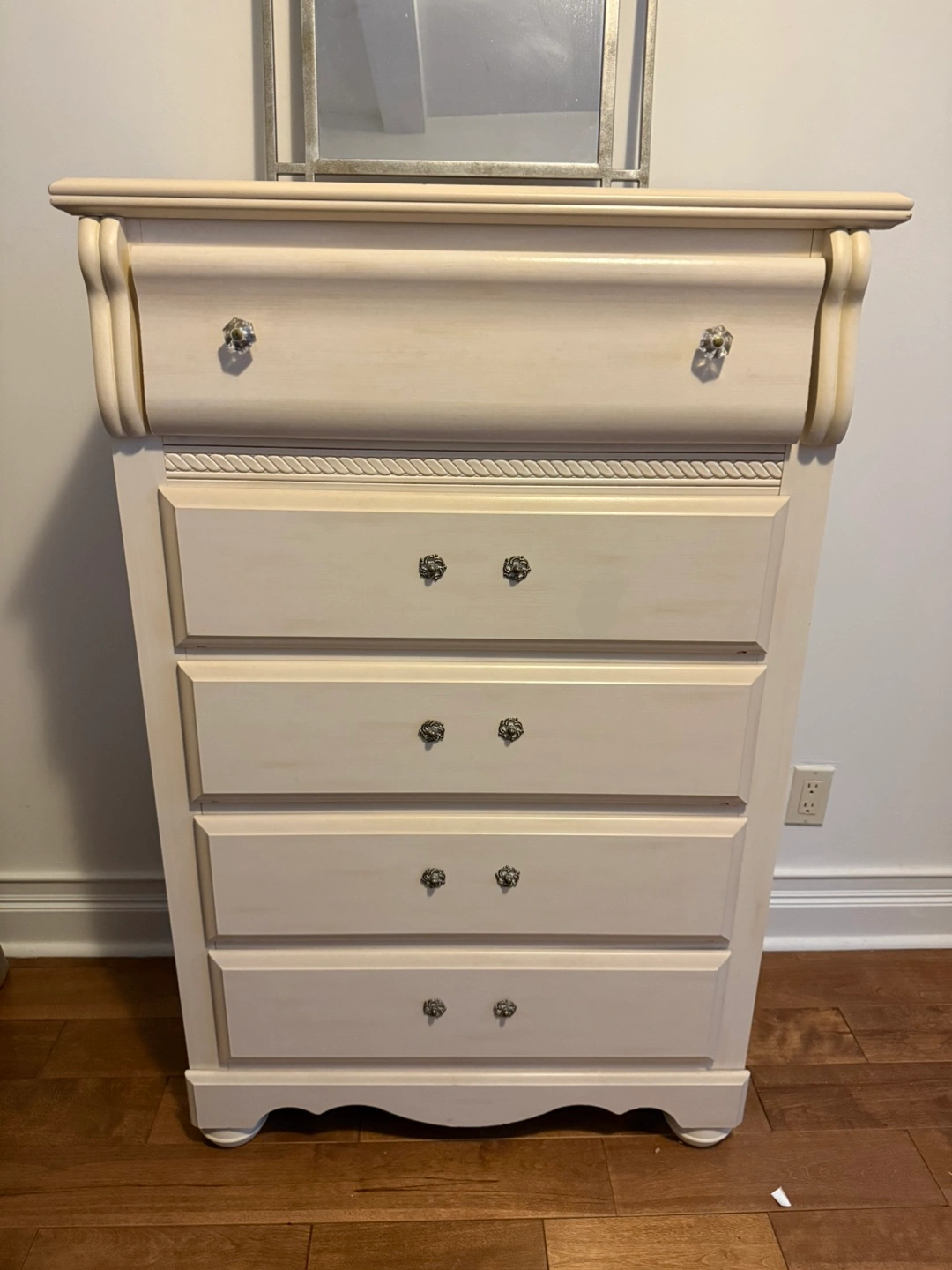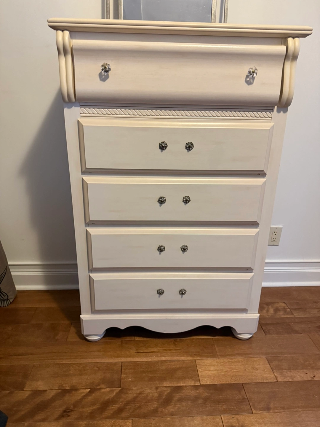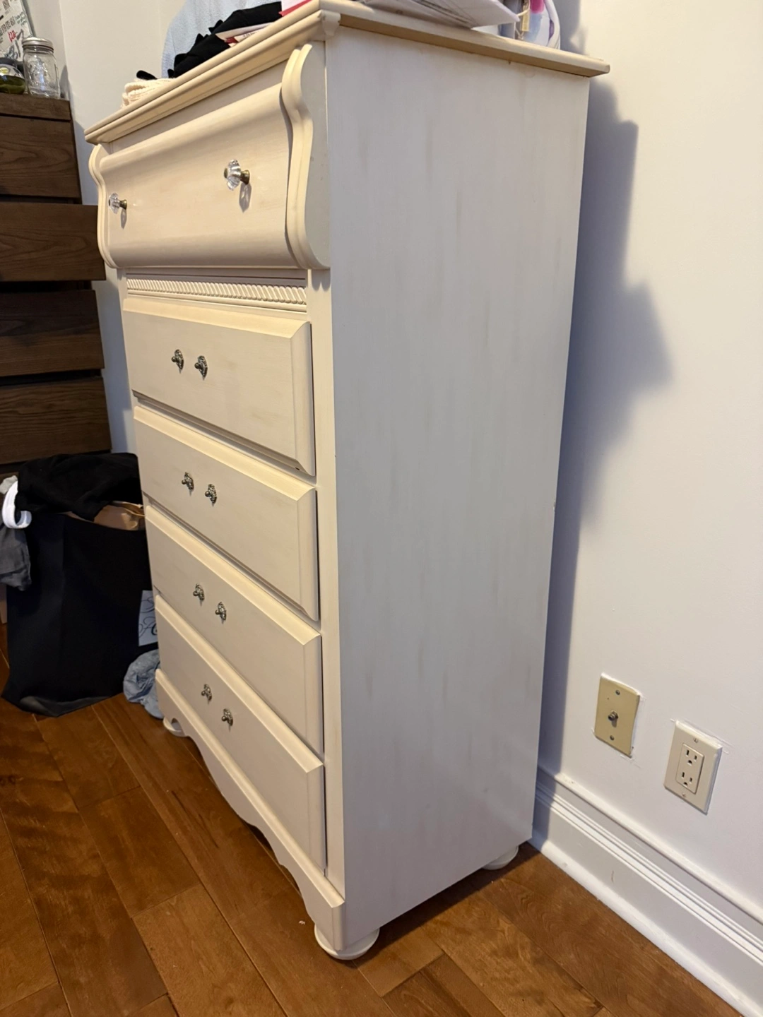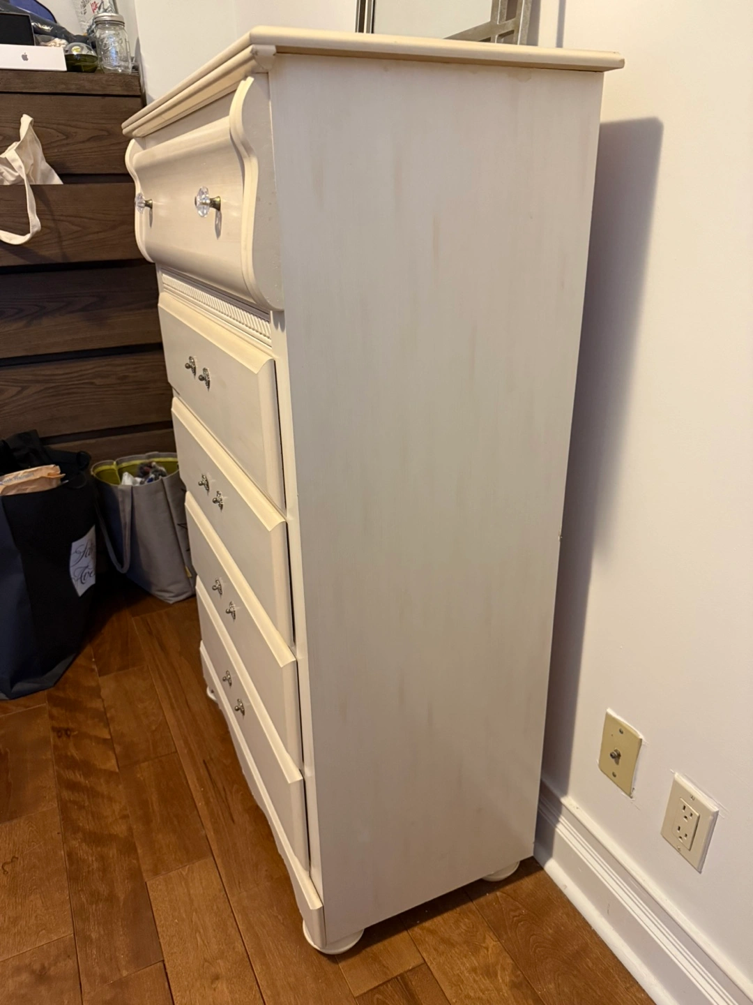 Beautiful drawer from real wood in great condition! Super minimal wear and tear. No big cuffs or scratches either at the surface or on the sides. Dimensions: Height: 46 inches Width: 32 inches Depth: 16 inches Pick up only. Elevator building. Note: missing handle bars, but drawers still easily open using circular handles!