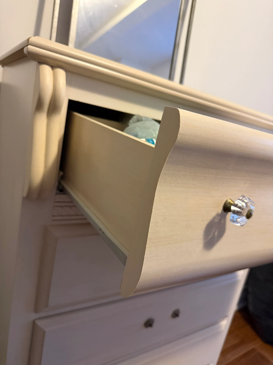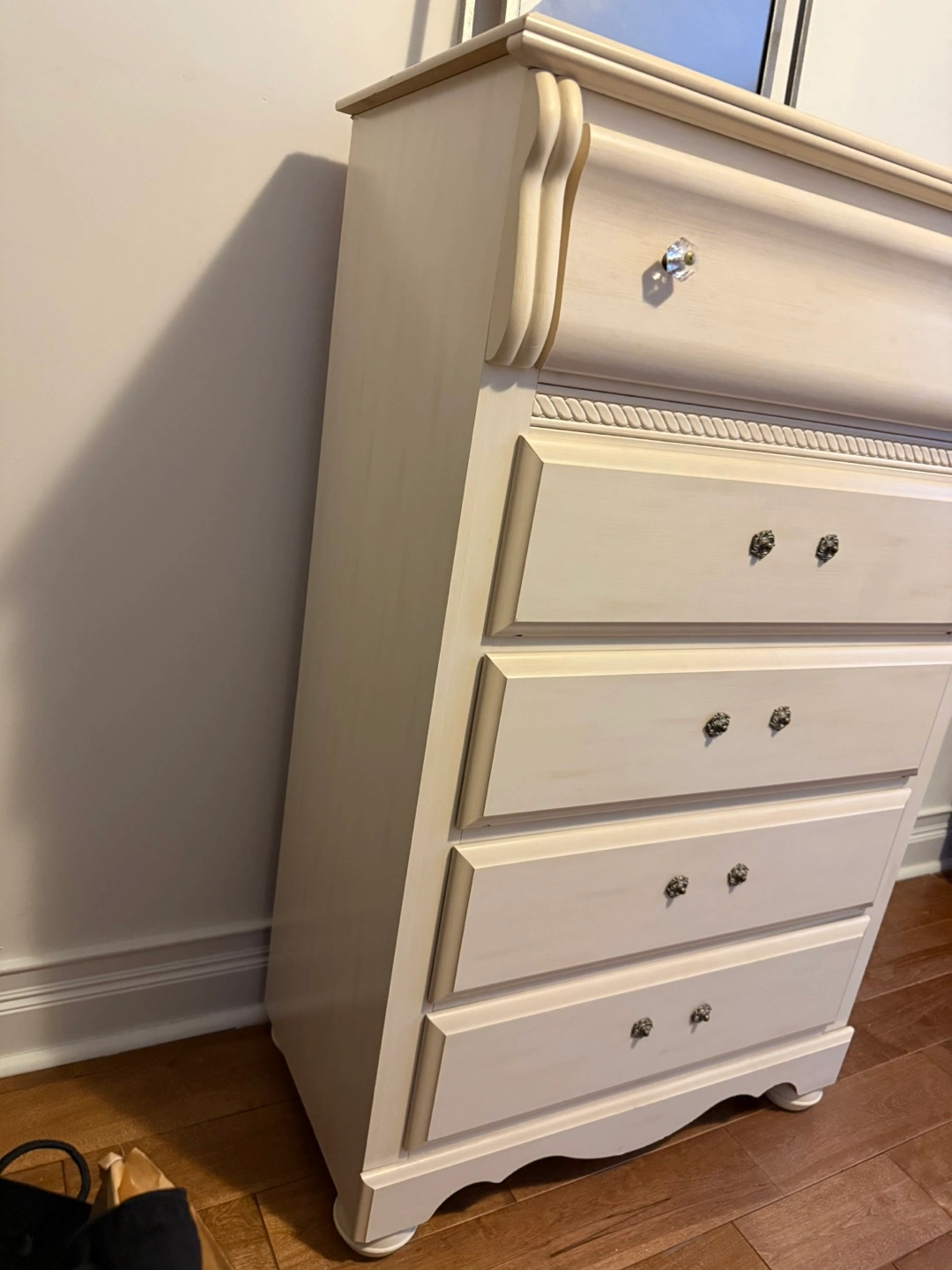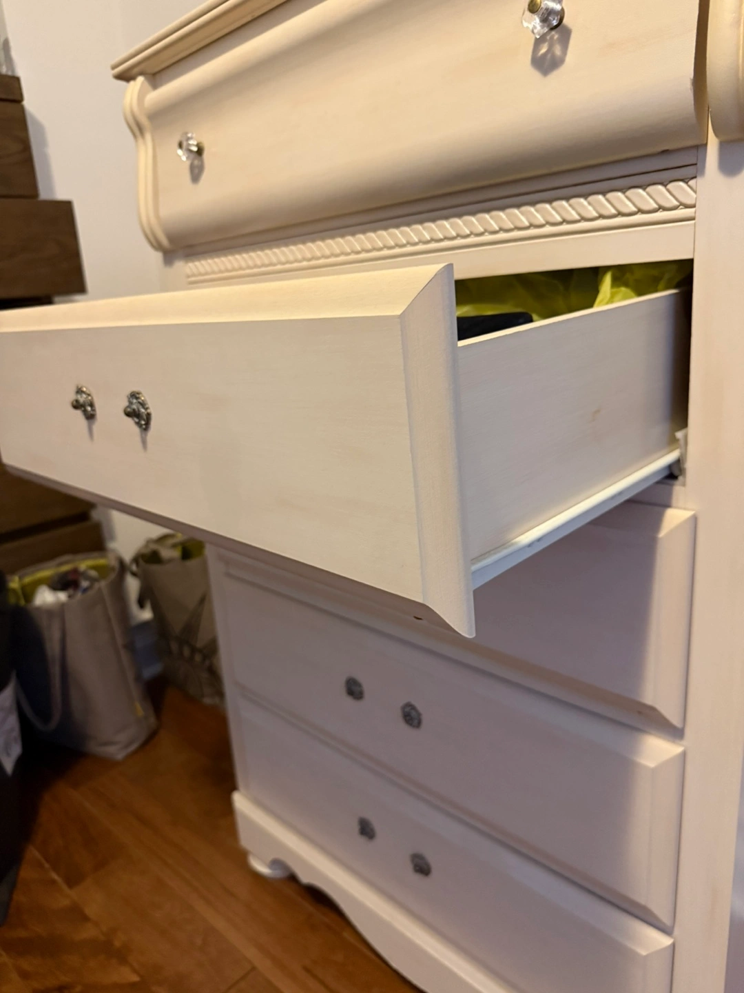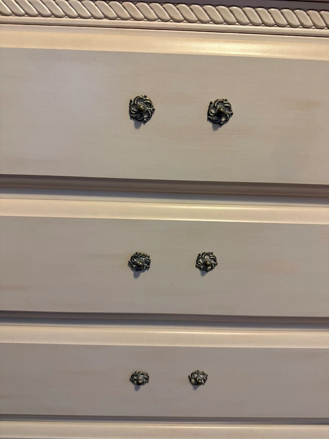 Beautiful drawer from real wood in great condition! Super minimal wear and tear. No big cuffs or scratches either at the surface or on the sides. Dimensions: Height: 46 inches Width: 32 inches Depth: 16 inches Pick up only. Elevator building. Note: missing handle bars, but drawers still easily open using circular handles!