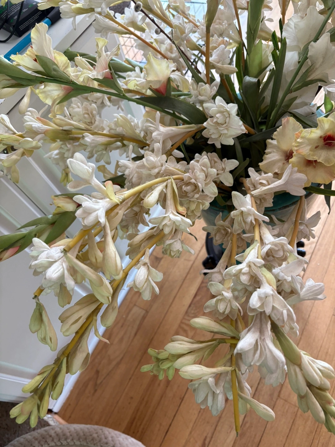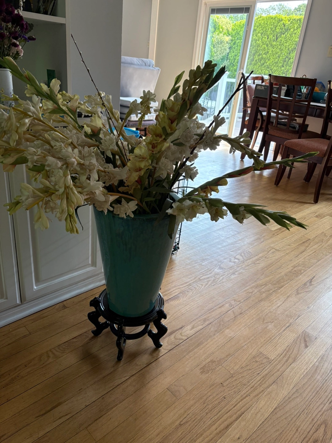 A tall turquoise vase with white flowers. The vase has a black decorative stand. This would be perfect to put in a corner to create a relaxing ambiance.