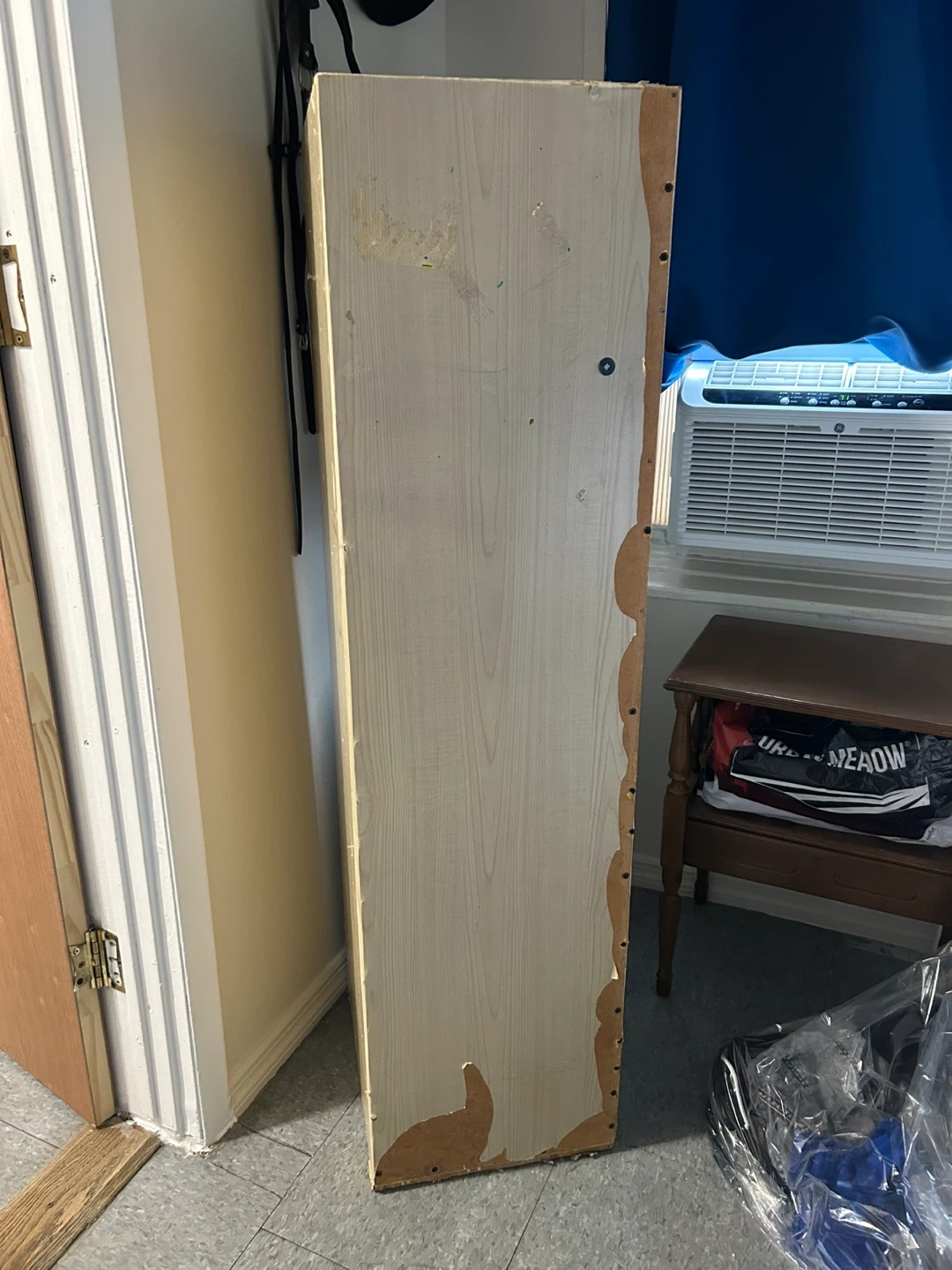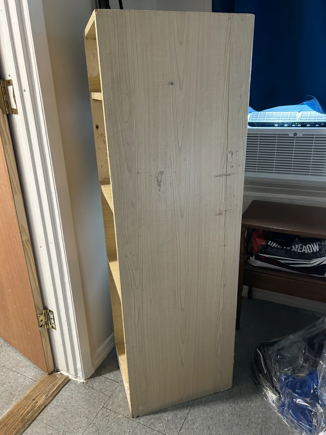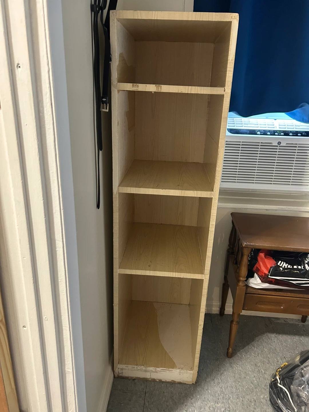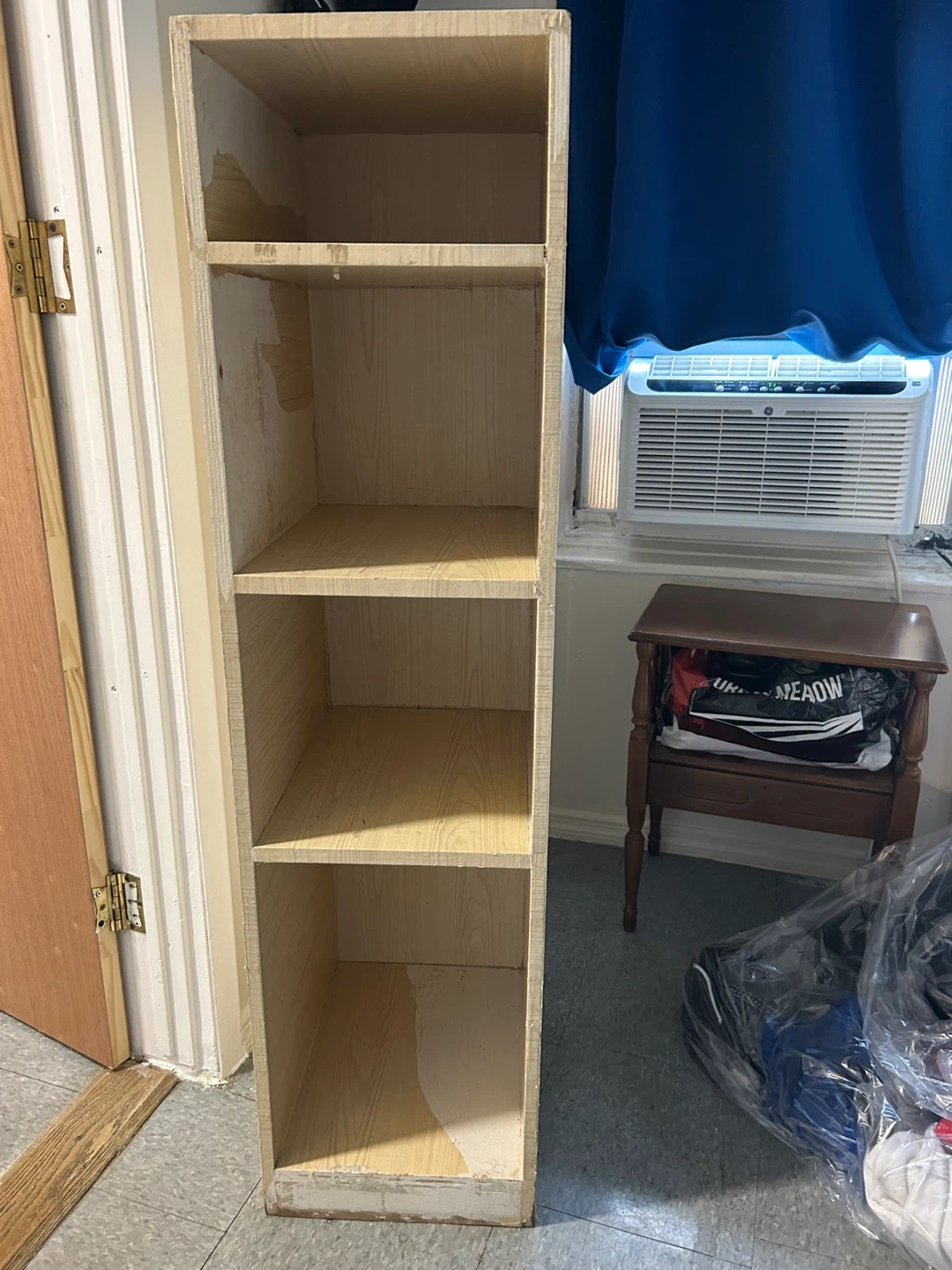 Giving away a tall wooden shelf. It’s got four shelves, perfect for storage or display. It's a bit worn, as you can see in the pictures. It is a custom made shelf it’s just that I have so much stuff and don’t fit in the shelf anymore. If you just put some shelf adhesive paper it will look like new,