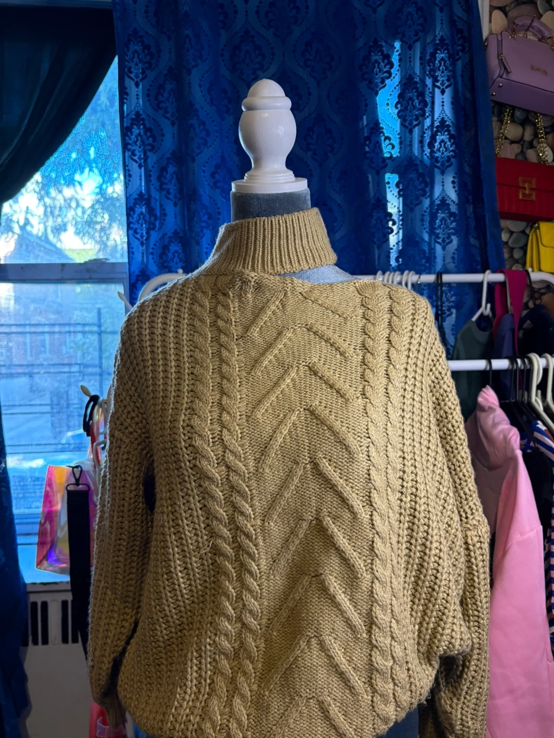 Selling a cozy tan knit sweater. It features a unique cable knit pattern. Perfect for staying warm and stylish!