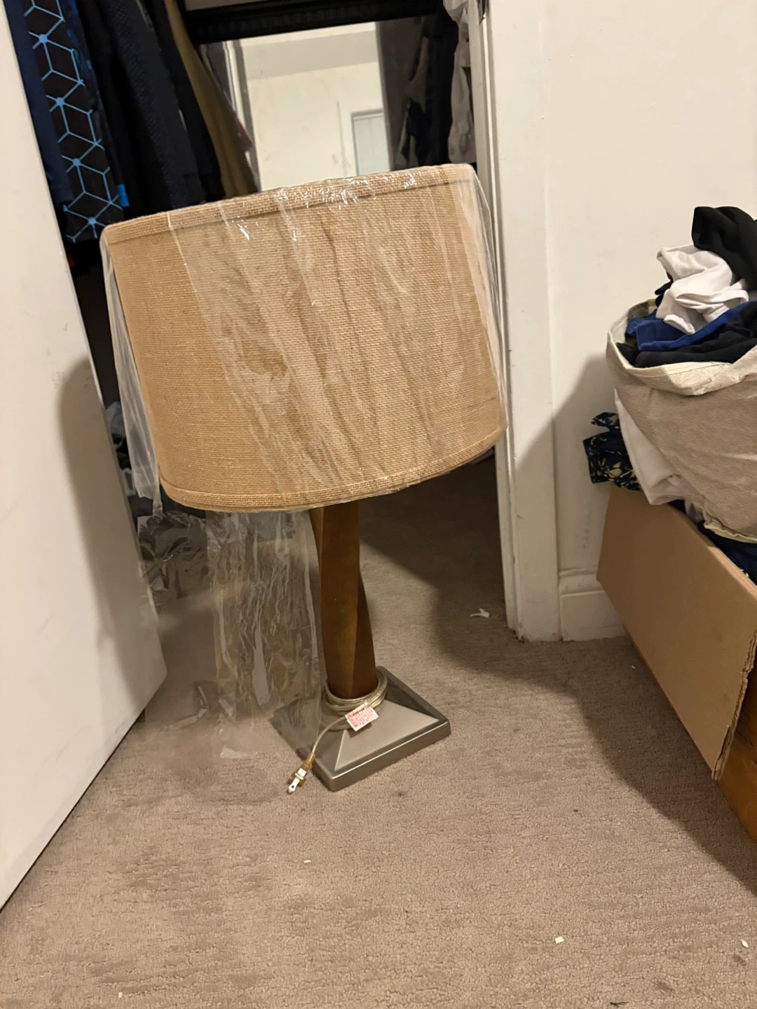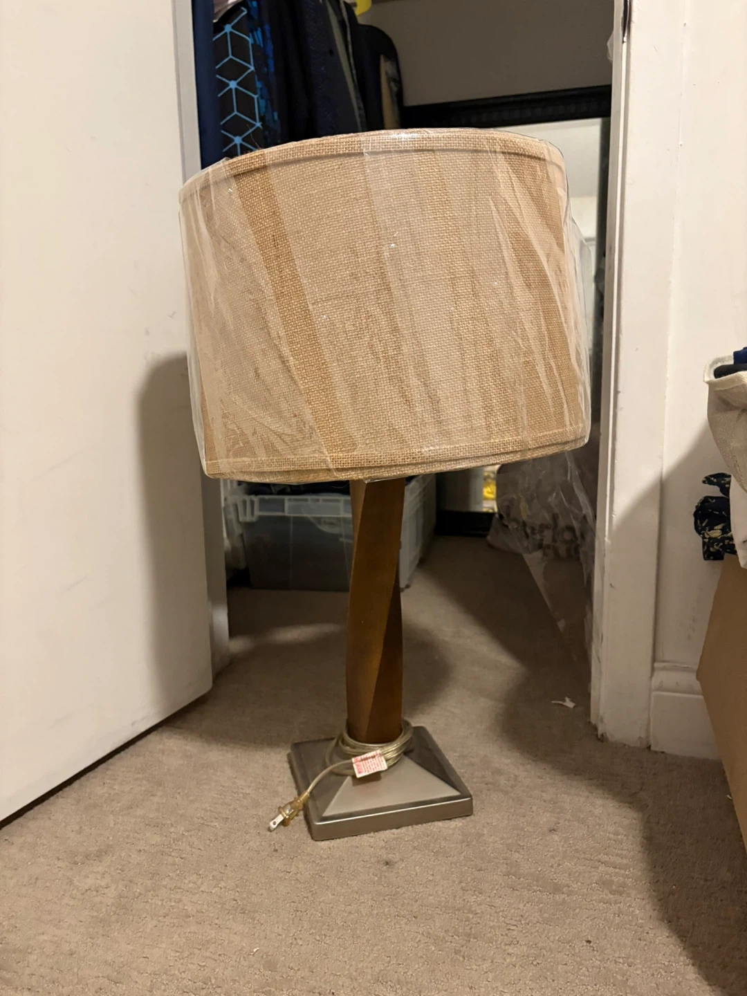 50Selling a large tan table lamp with a burlap shade. It's in new condition and would look great in any room.