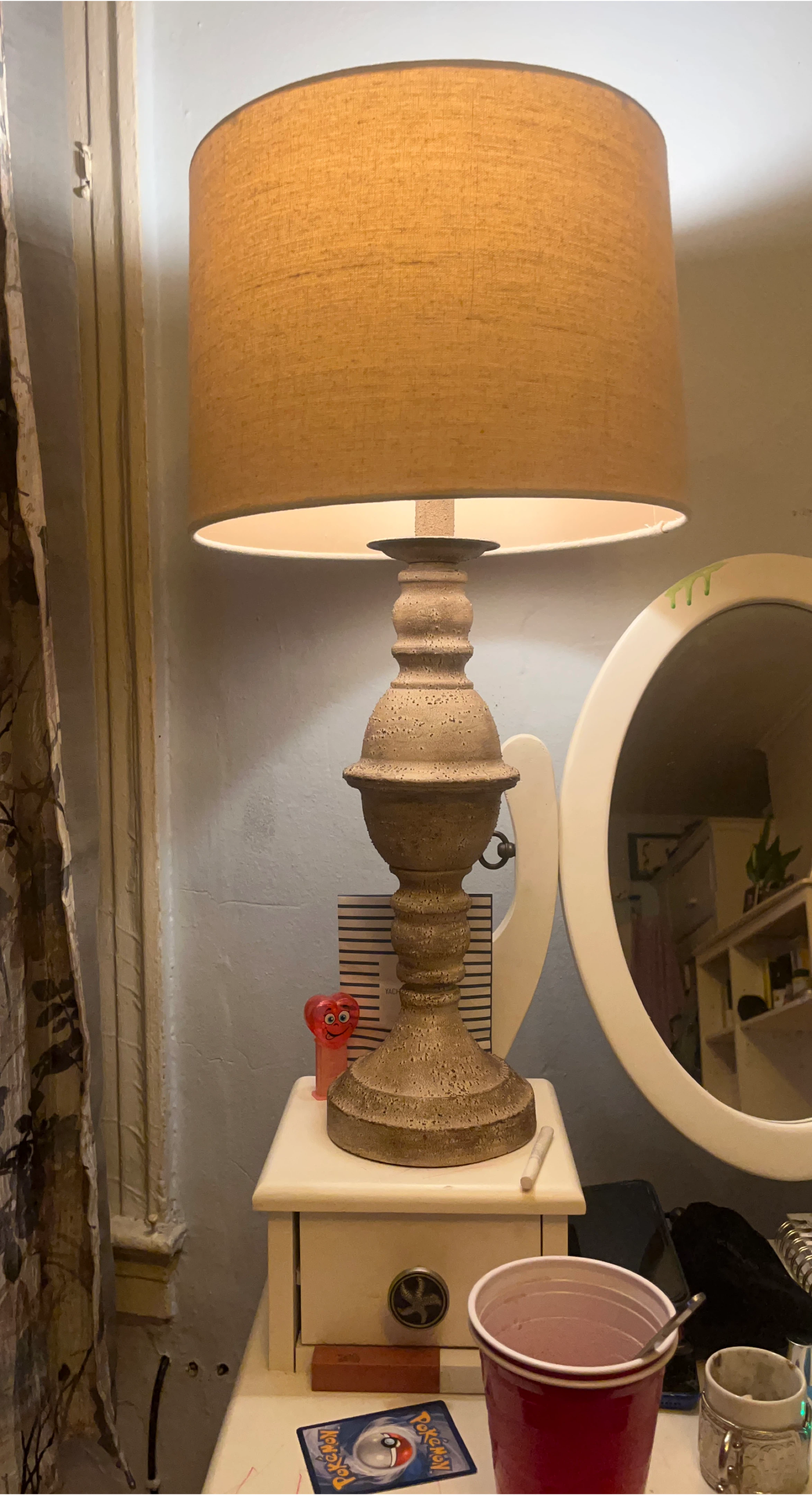 Selling a tan table lamp with a textured base! It's in good condition and would be a great addition to any room