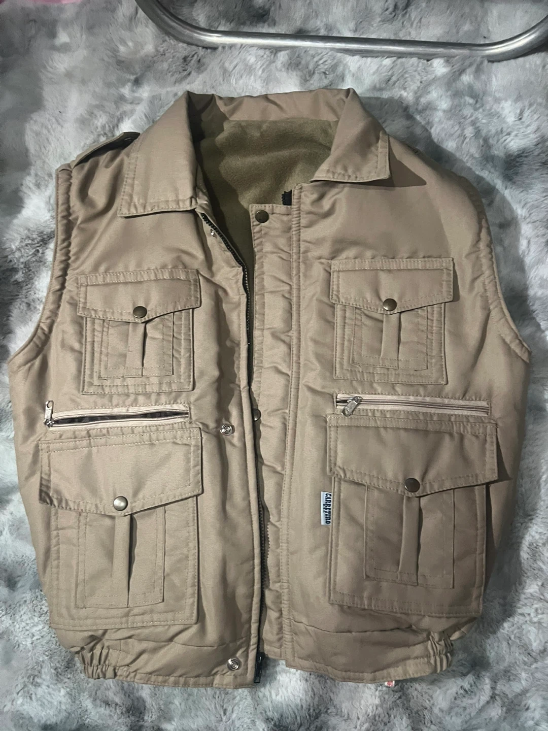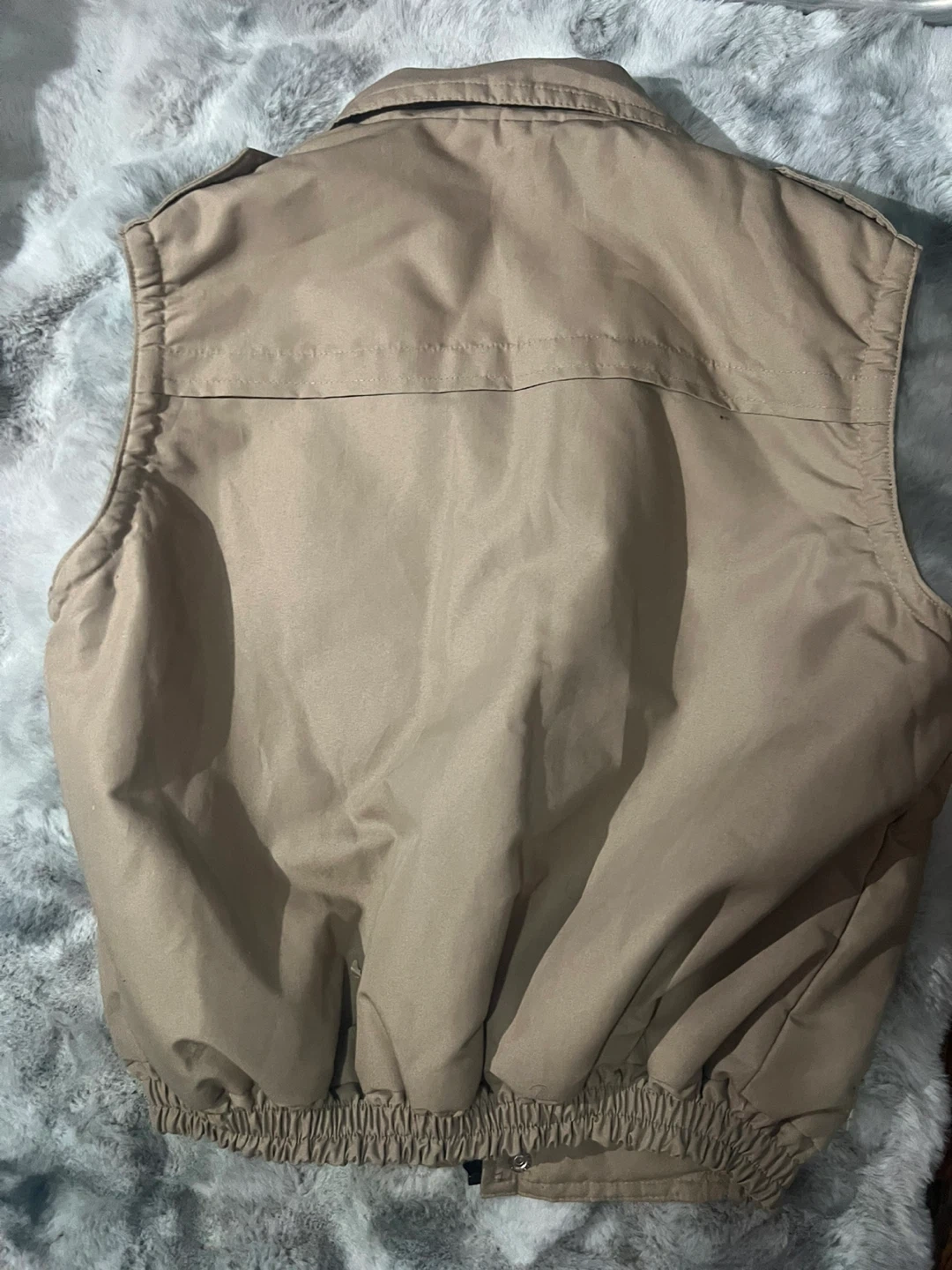 Here's a tan utility vest with lots of pockets! It's great for outdoor activities or just adding some extra storage to your outfit