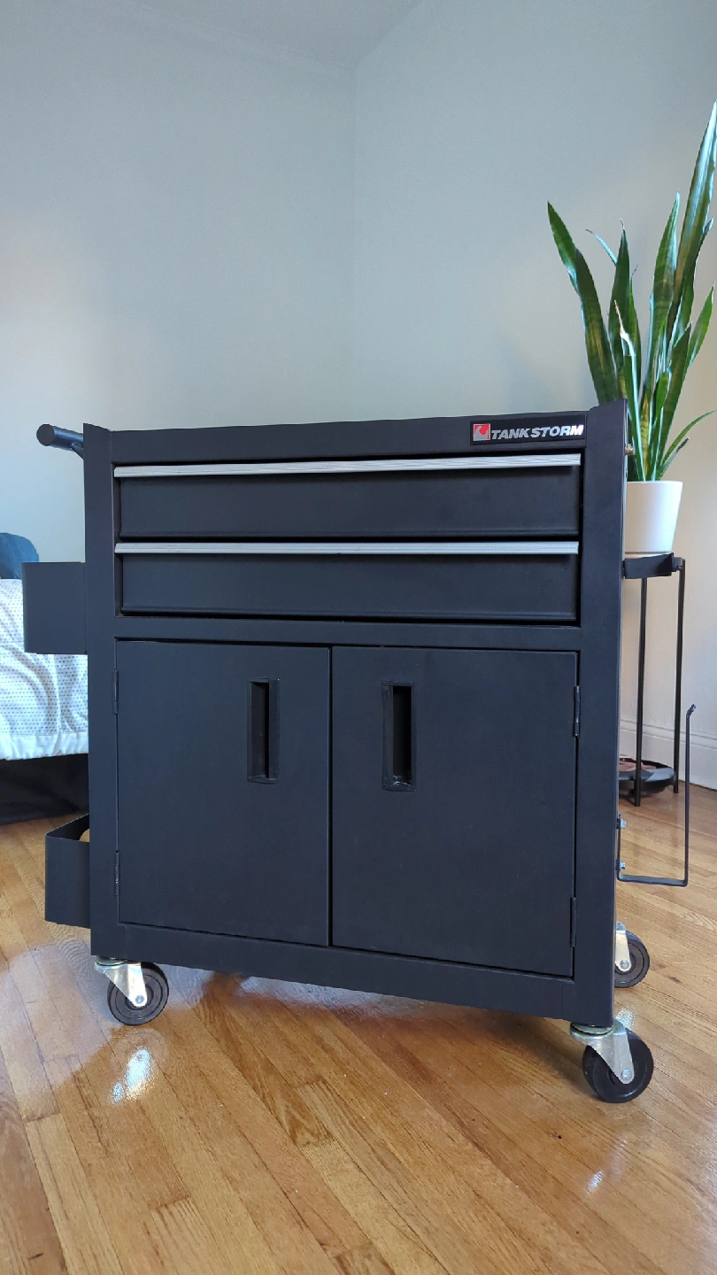 Selling a TANKSTORM rolling tool chest! It features two drawers and a cabinet with doors. Perfect for organizing your tools in the garage or workshop